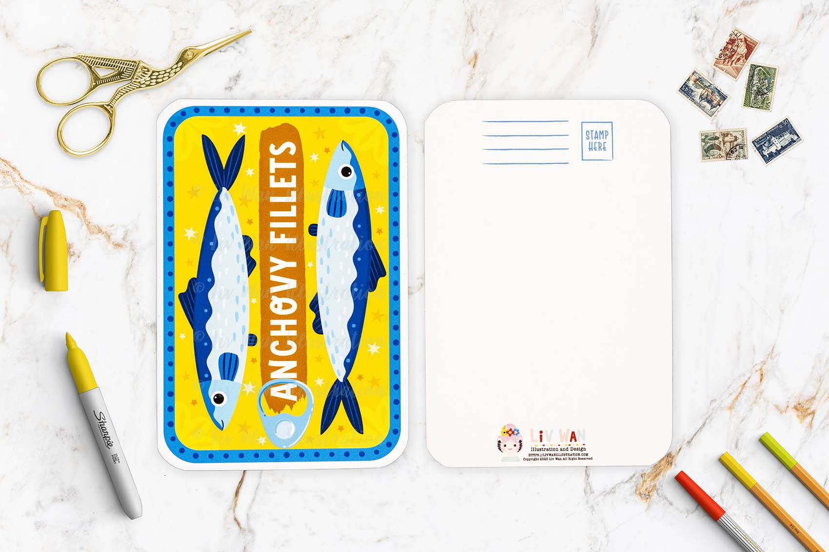 Introducing my Anchovies Postcard. This fun A6 5.8″ tall Anchovies Postcard is part of my Pantry collection, celebrating many things that I keep in my pantry.
