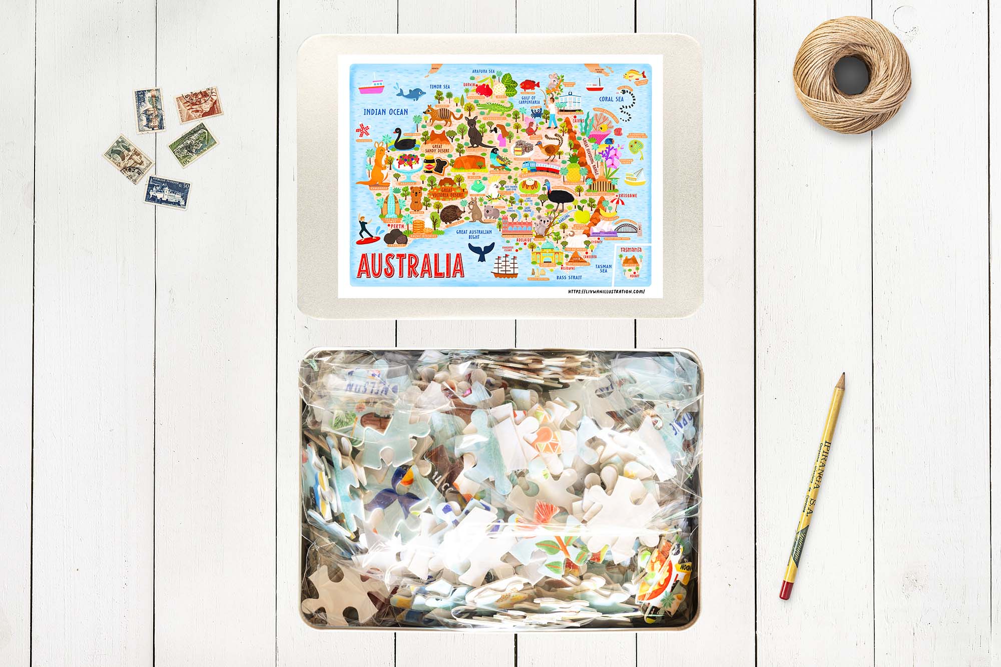 For sale is an illustrated Australia map jigsaw puzzle with 1000 pieces. I’ve never been to Australia but I would love to visit. With help from friends and the internet, I researched Australia extensively and was able to make this jigsaw puzzle.