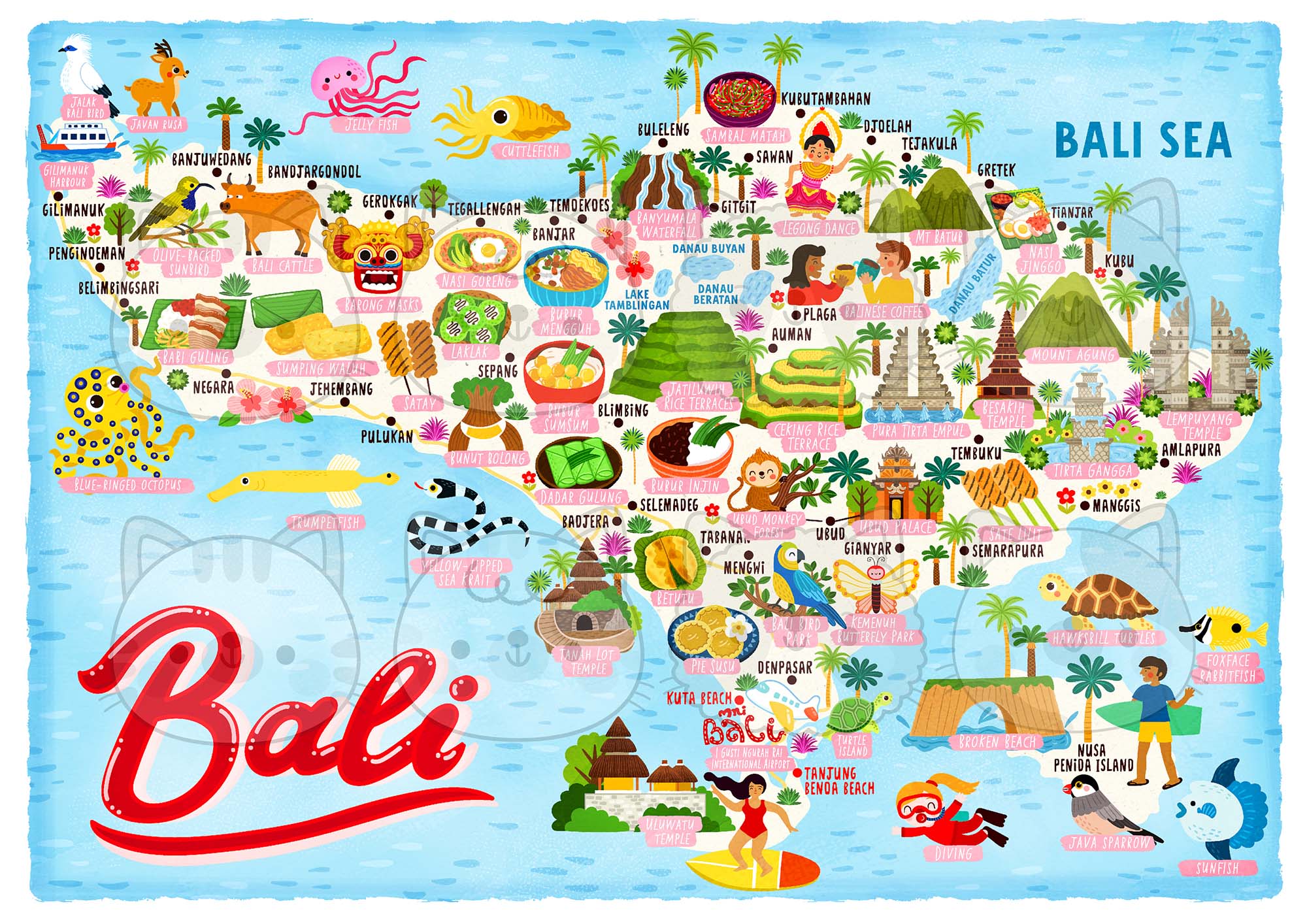Introducing my 46th map, and sixth map of 2023, this enchanting illustrated map of Bali. I visited Bali over a decade ago and it was a great experience; fabulous food, stunning weather and extremely beautiful, and this year I received a few requests to create a Bali Map so here it is.