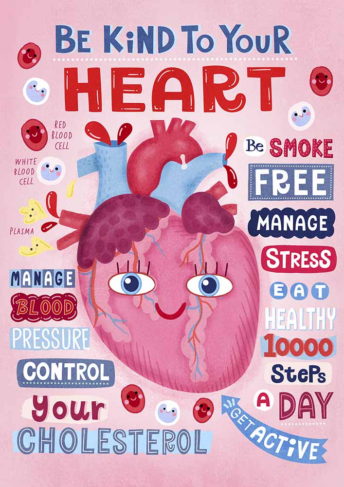 I was inspired to create a series of posters based on the theme “Be kind to yourself”. Be kind to yourself is literally about looking after yourself; look after your heart, your kidneys, your lungs, and your liver. While this is a serious theme, and I’ve had my fair share of health issues, I wanted to make this series a little fun and cute to attract more viewers.