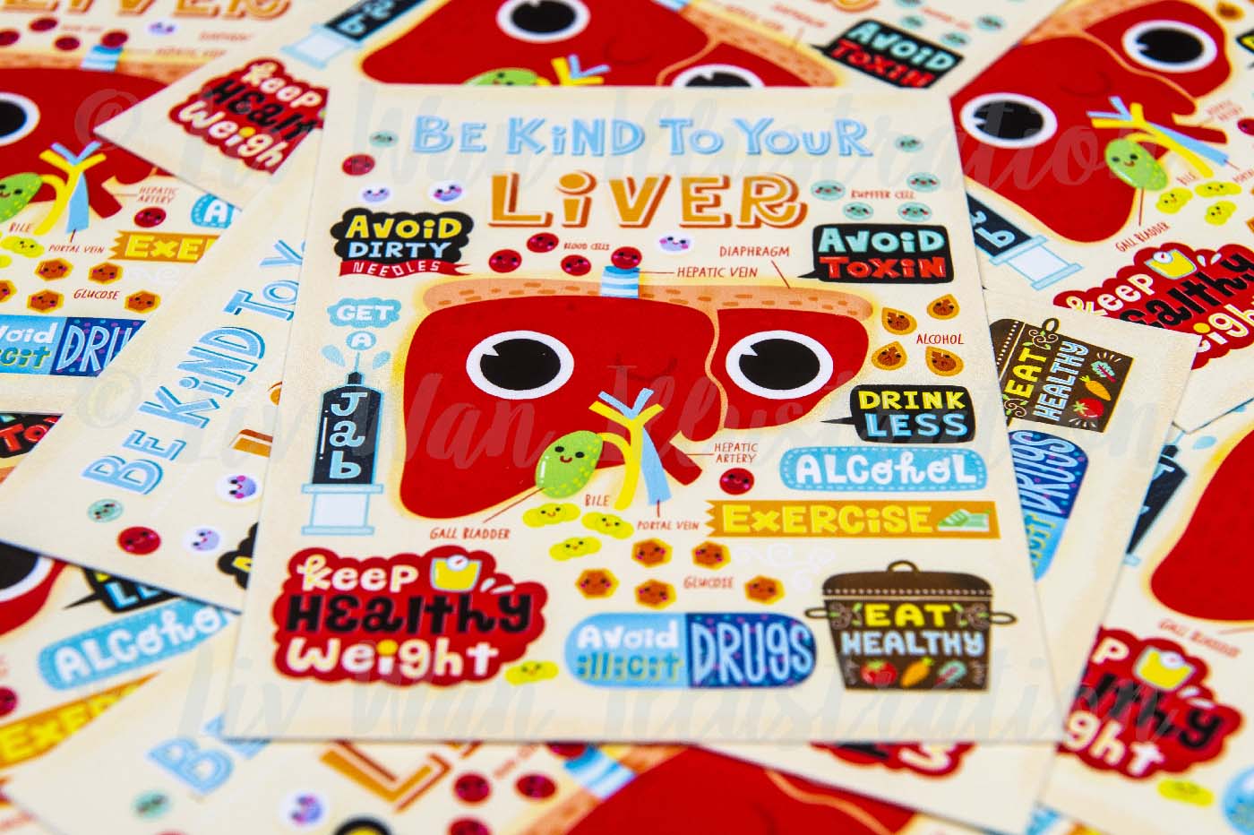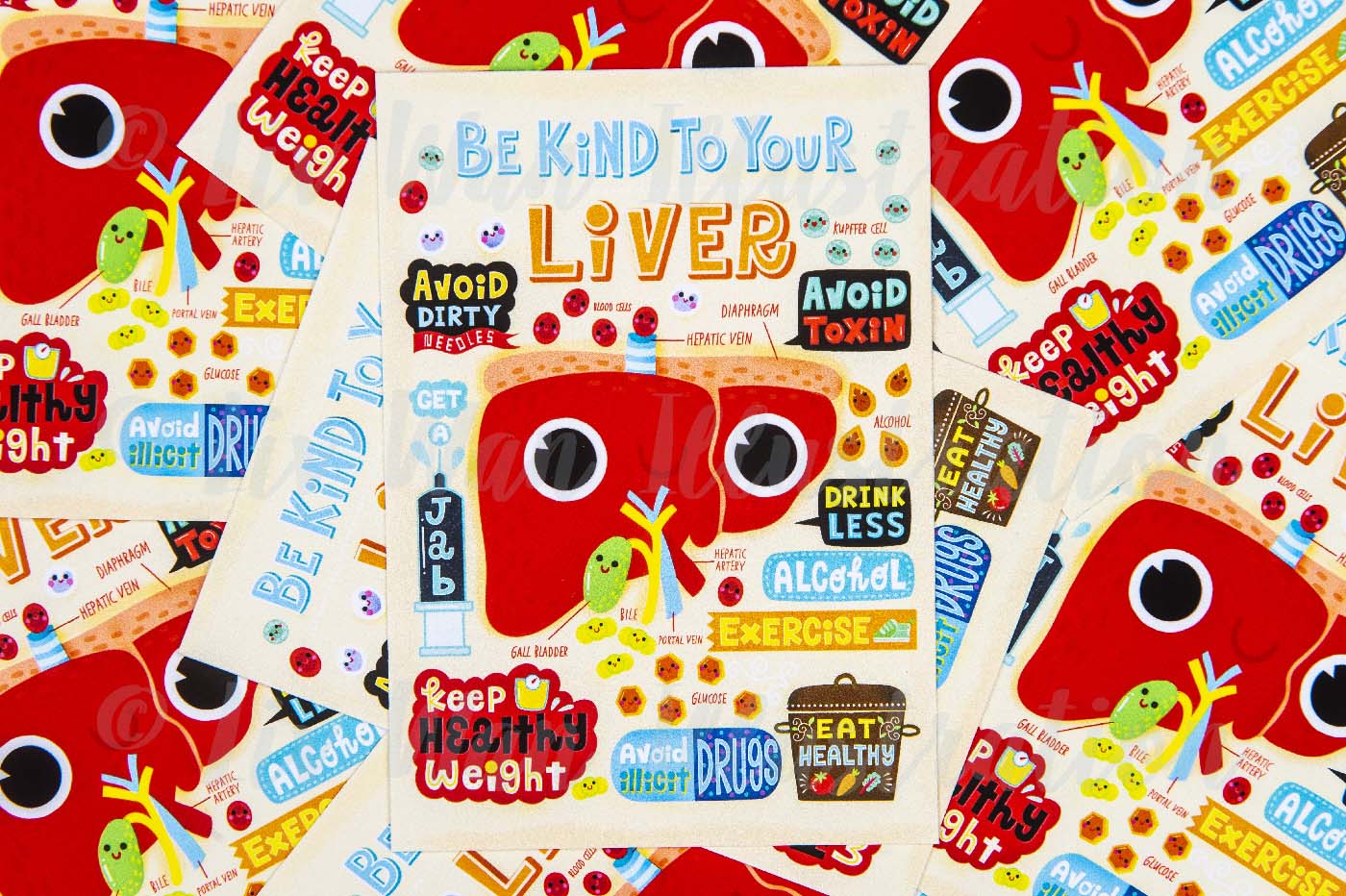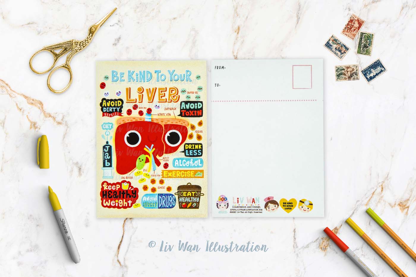 If you are collecting beautiful, unique, and special postcards, this Be Kind to Your Liver postcard should definitely be added to your collection. I’m now doing a wholesale service, so if you are a retailer and you’re interested in my postcards, prints, or any of the other products I have listed on my website, please contact me anytime.