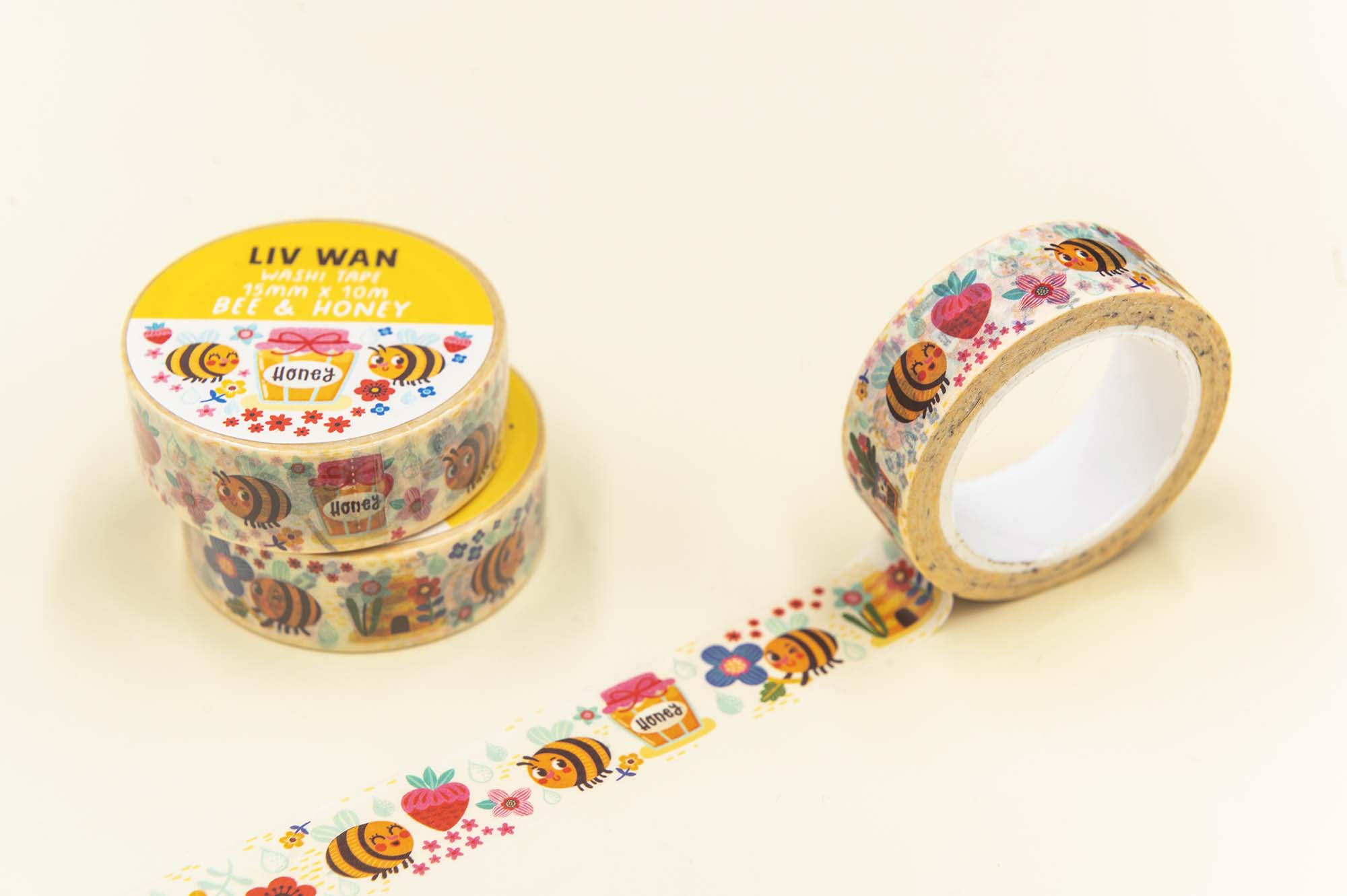 These are designed by myself in the UK but manufactured abroad. This Bee and Honey Washi Tape has a semi-permanent adhesive coating that allows for some repositioning.