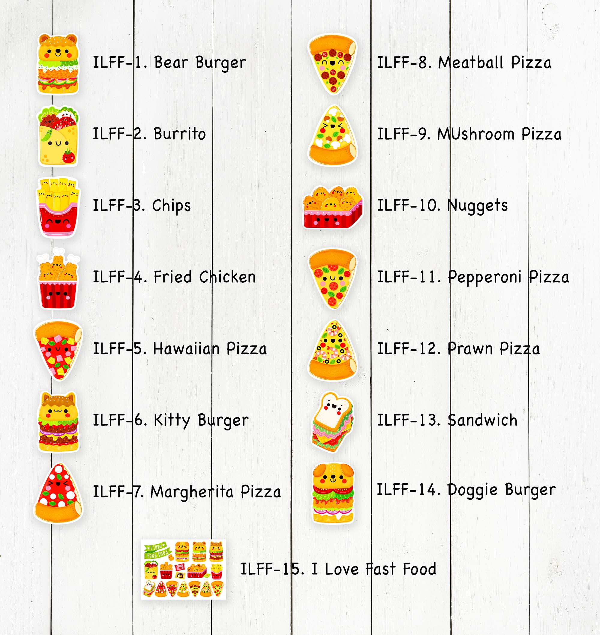 This I Love Fast Food Postcard Collection is made up of 15 cards in total; 14 die-cut shaped postcards and 1 rectangle postcard.