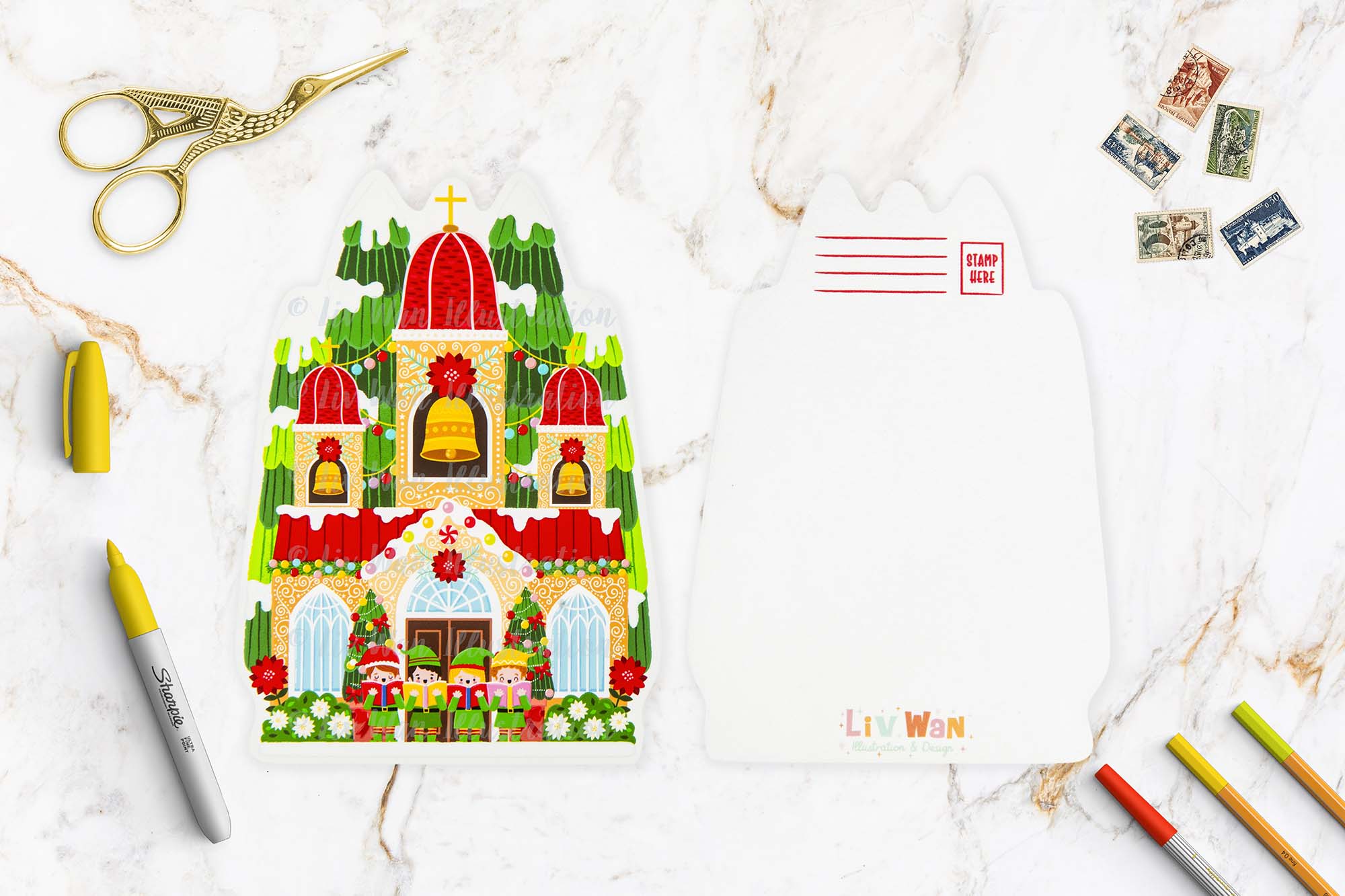 This Christmas Elf Church postcard has been designed and made by myself. There has been no outsourcing, and no printing in a foreign country whatsoever. This ensures this product is of the highest quality but also dramatically drops any carbon emissions. My aim is to keep everything as green as possible.