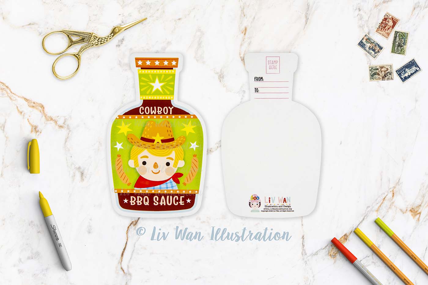 Cowboy BBQ Sauce Postcard. Really fun A6 5.8″ tall shaped postcard. I love a good condiment and this card is one of 21 condiment postcards. 20 of these postcards are shaped postcards.