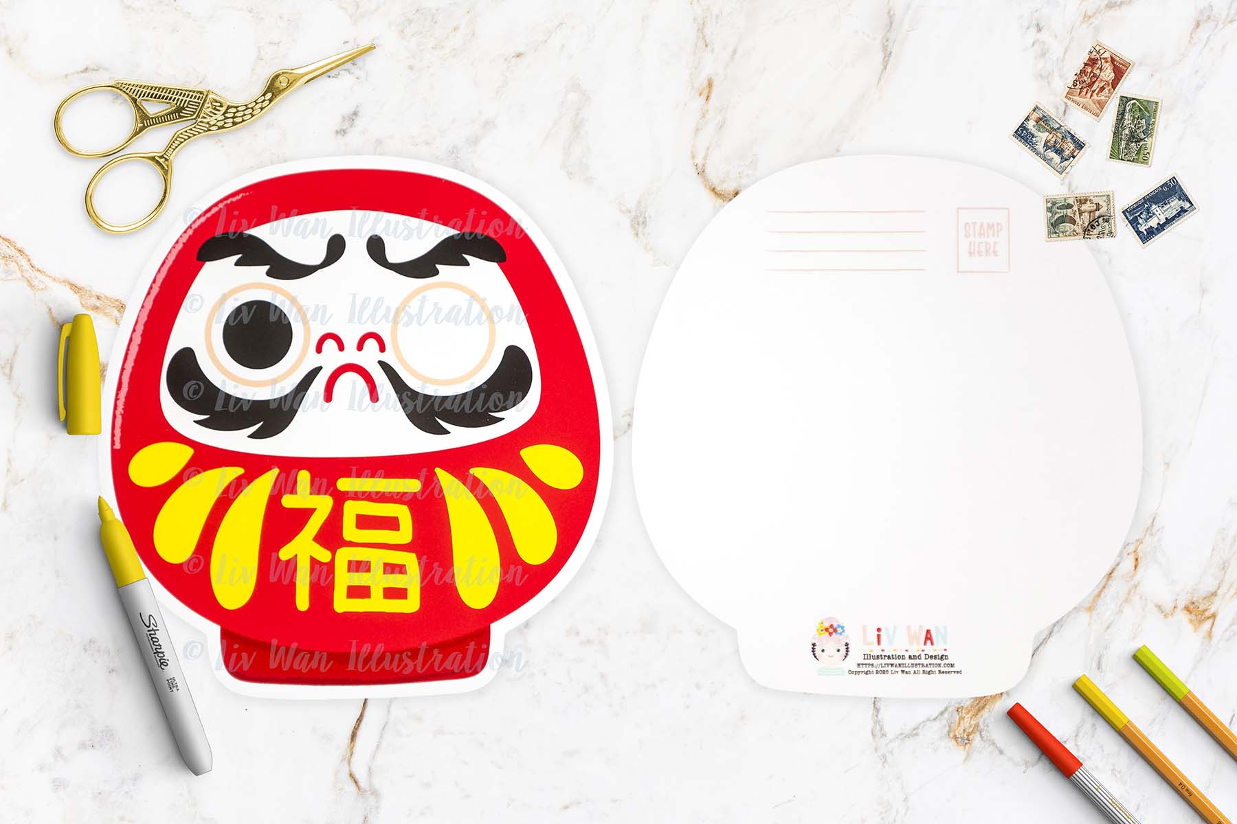 Daruma Postcard. Summer 2025 I participated in a Japanese themed convention so I created five die-cut shaped postcards for this, one of which included this Daruma Postcard.