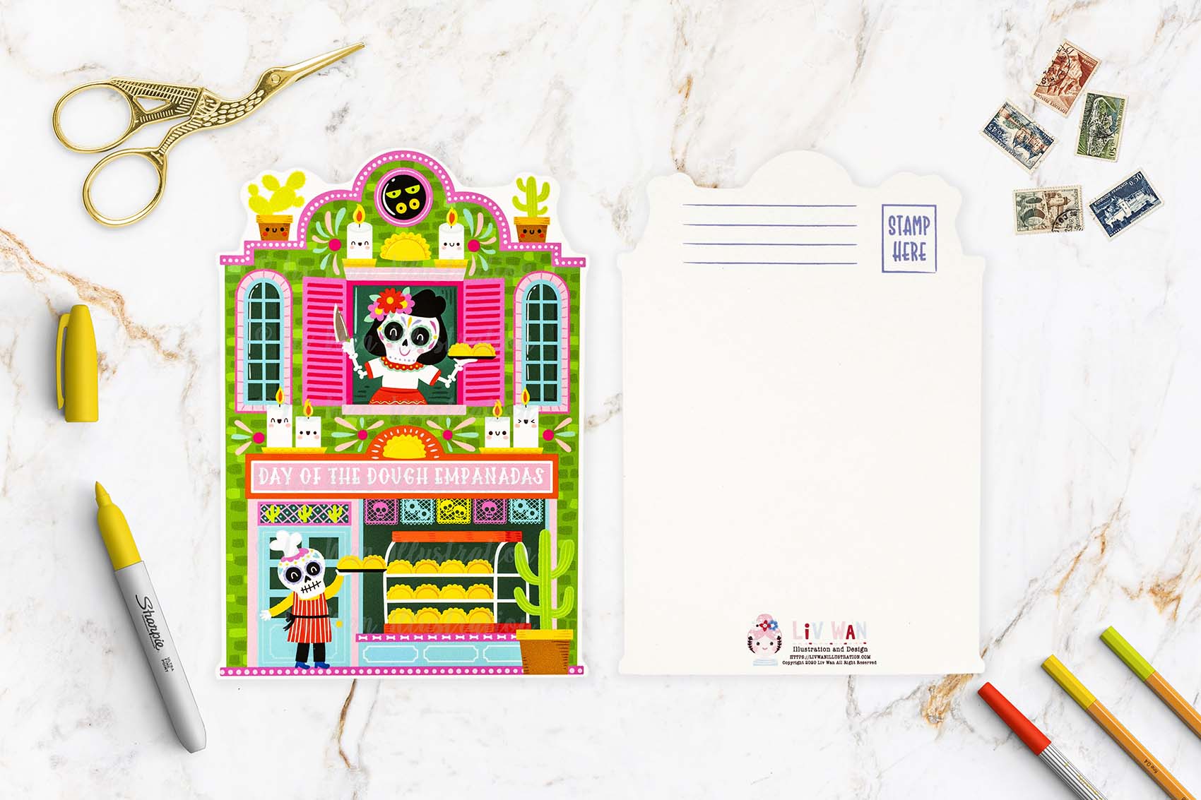 For my third collection of Halloween cards, I have created seven really fun die-cut-shaped postcards for the 2023 Halloween season, one of these being this Day of the Dough Halloween Postcard.