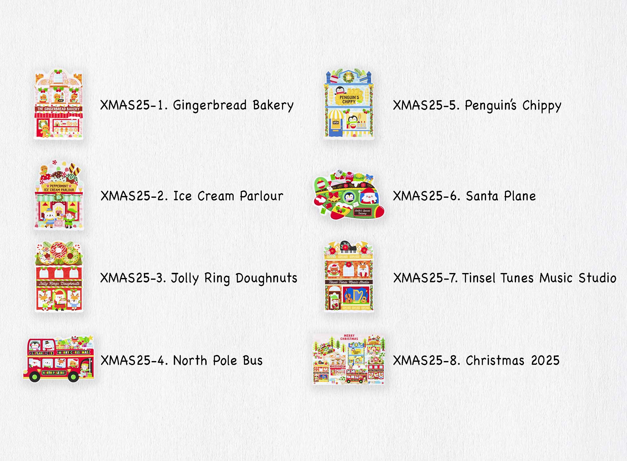 For Christmas 2025 I’ve created eight brand new postcards which is made up of 7 die-cut shaped postcards and 1 rectangle with a Christmas shop theme.