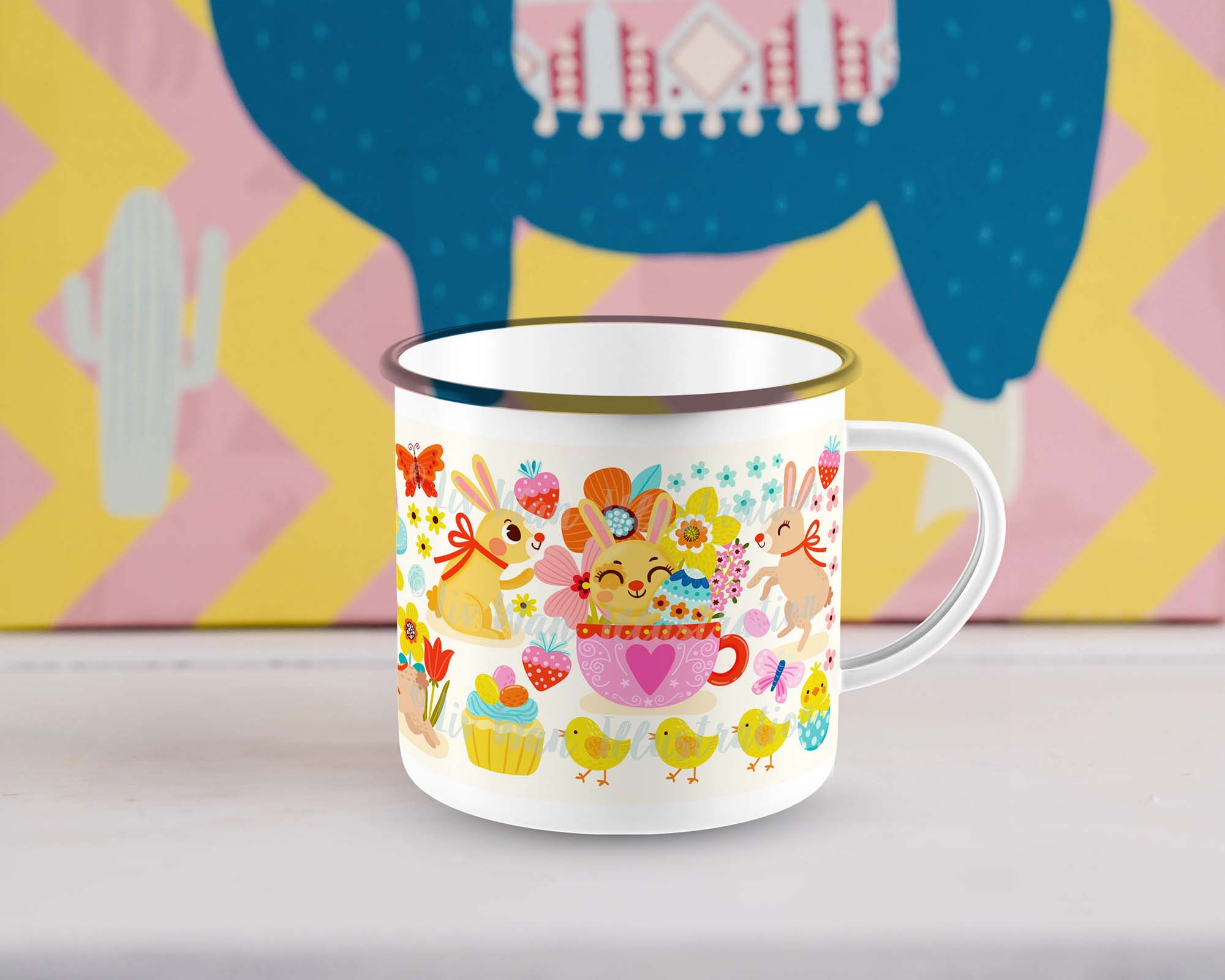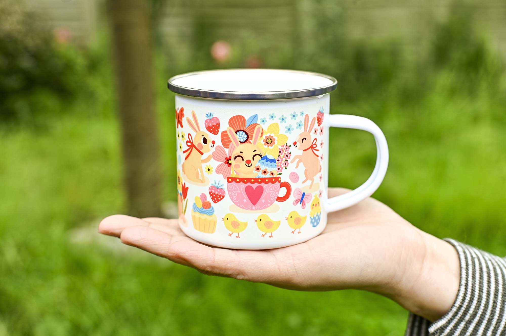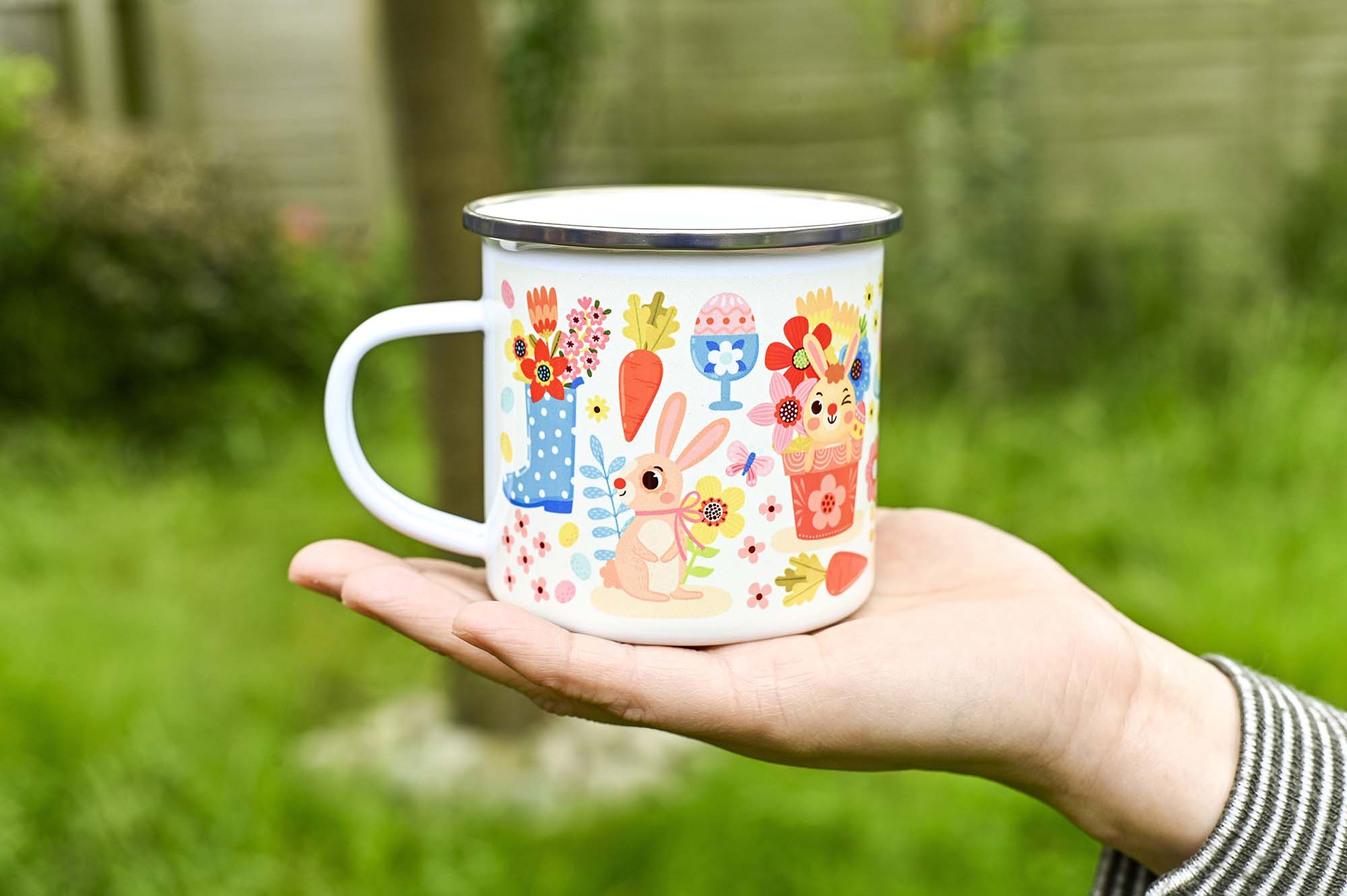 12-ounce enamel mug with an Easter bunny theme. Over the last few years I’ve had the pleasure of creating many different pattern designs for a number of clients so for 2024 I’ve created a whole series of new enamel mugs using my pattern designs.