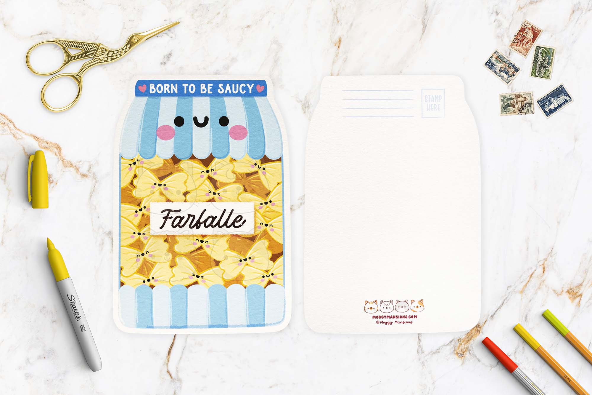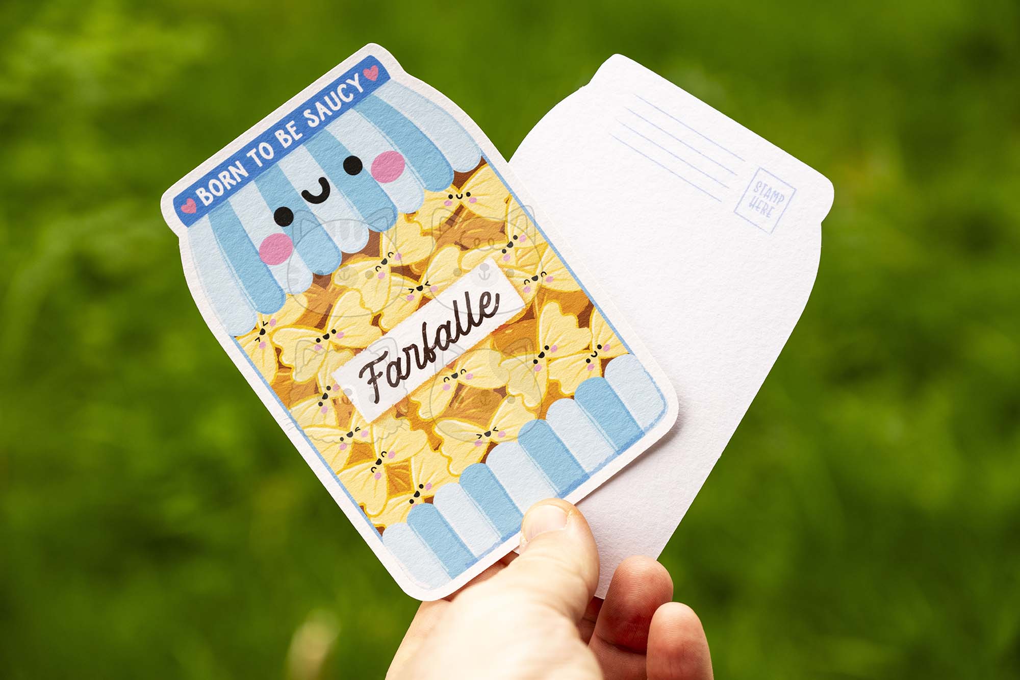 Introducing our Farfelle Postcard. For 2026 we’ll be trading at two major conventions in France so we’ve designed and made a small colletion of French food postcards. This fun A6 5.6″ tall Farfelle Postcard is one of these postcards but has also been included in my pantry collection.