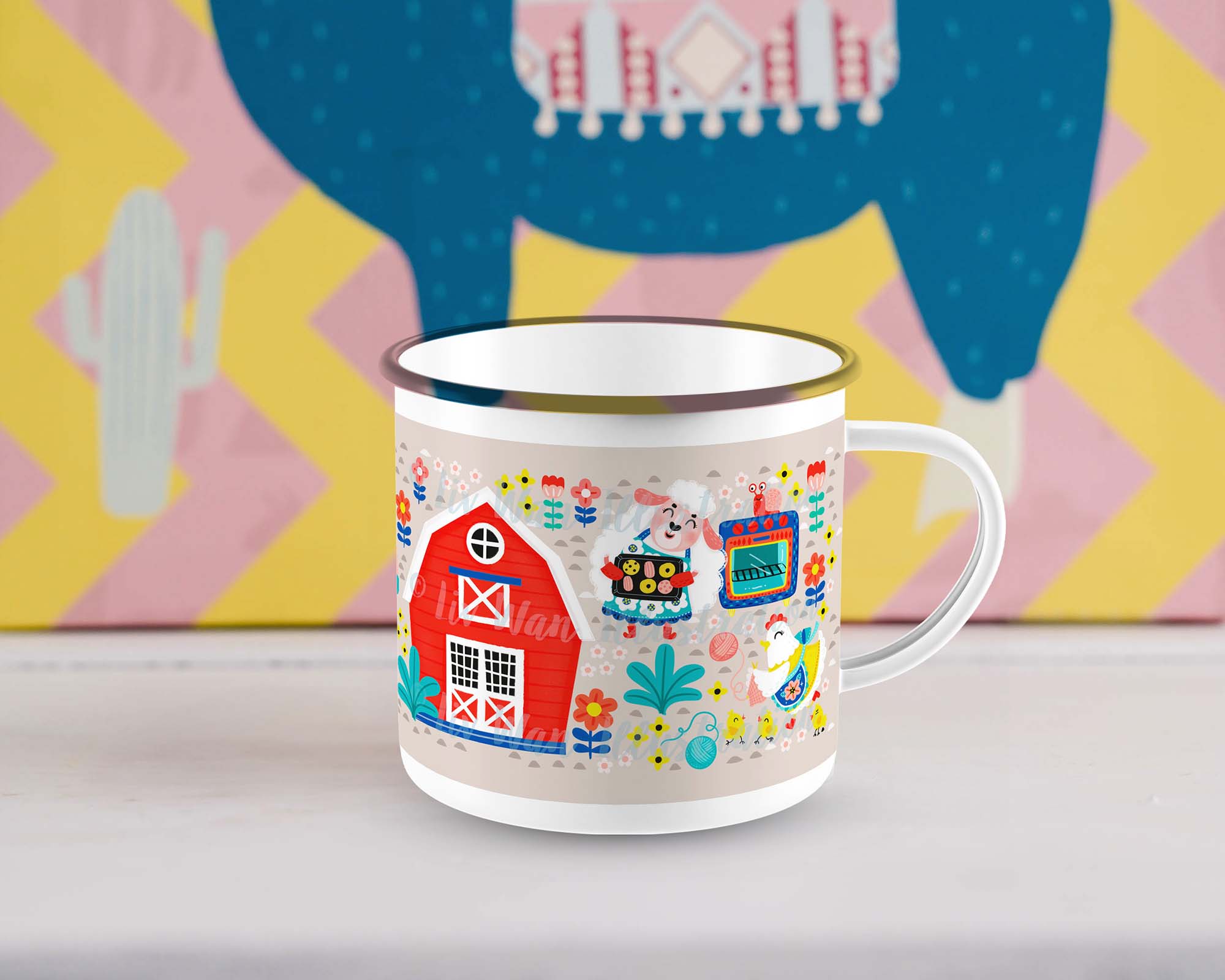 12-ounce enamel mug with a farm animals theme. Over the last few years I’ve had the pleasure of creating many different pattern designs for a number of clients so for 2024 I’ve created a whole series of new enamel mugs using my pattern designs.