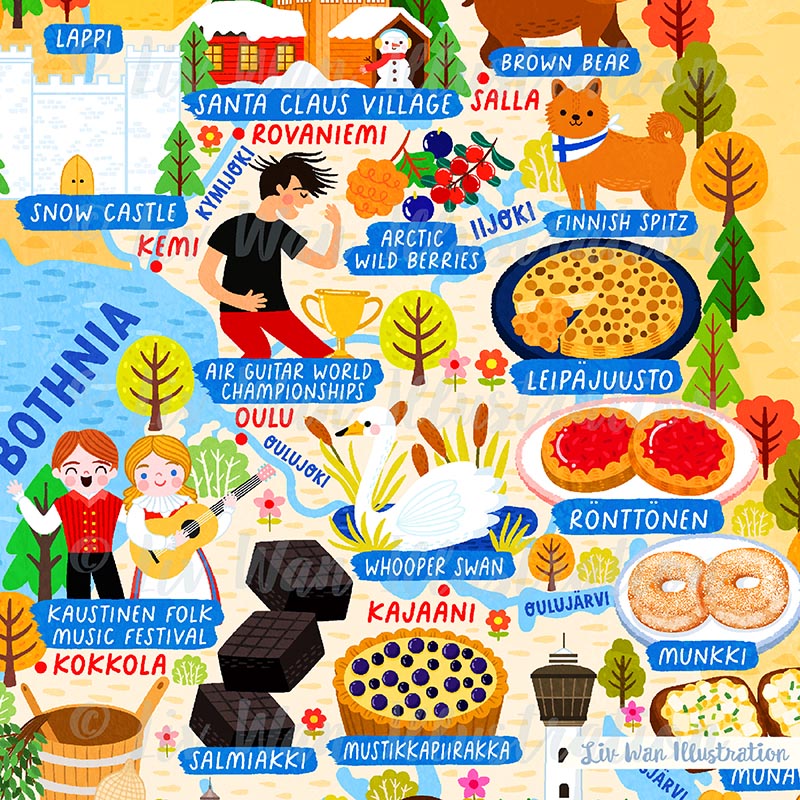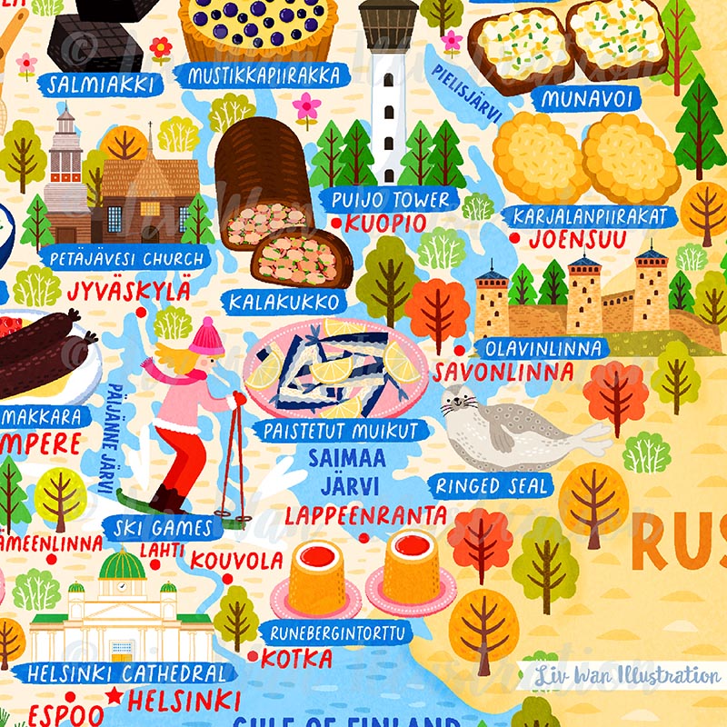 As with all of my maps, there are absolutely tonnes of detail in this Finland Map Postcard. There are people, buildings, cities, animals, food, and many other things.
