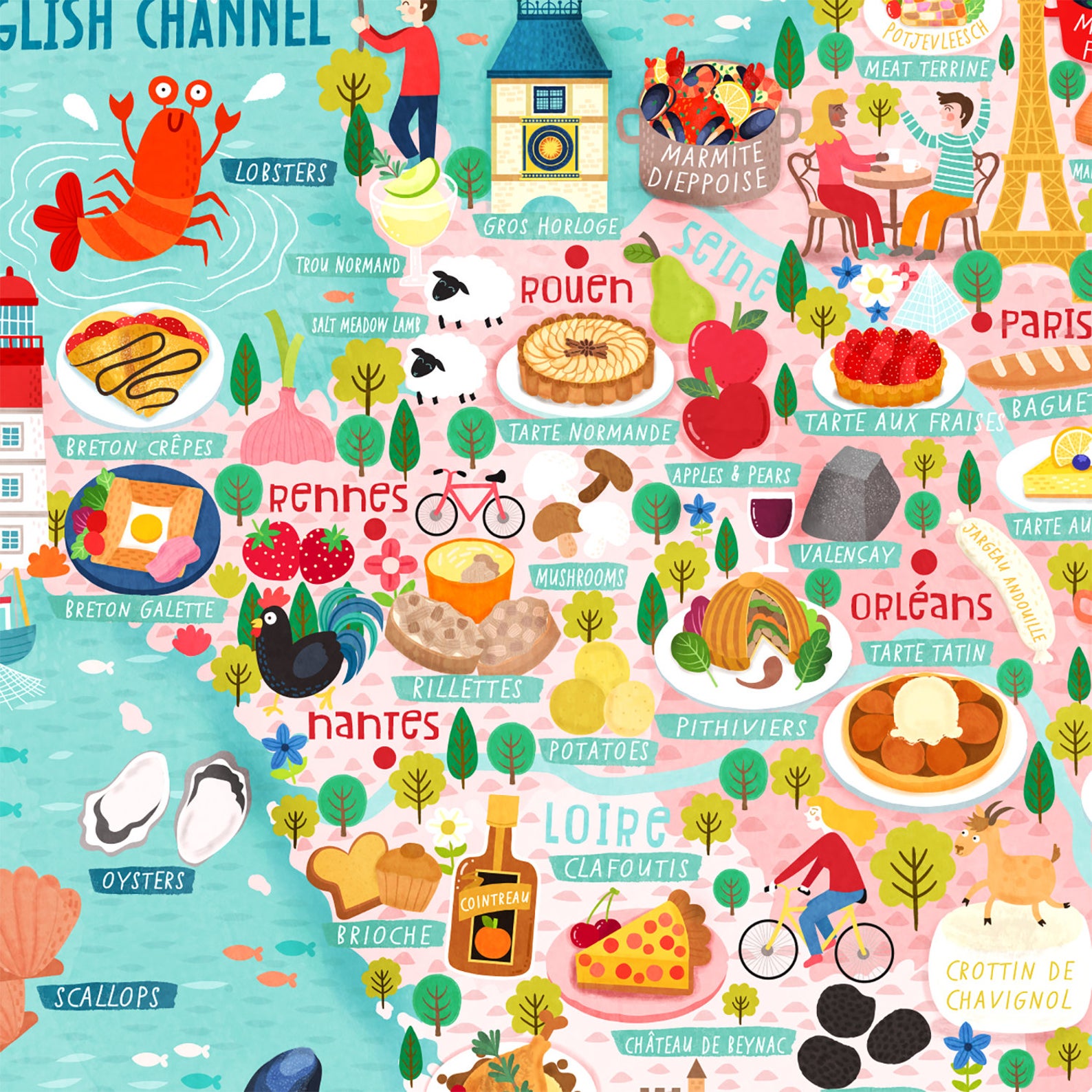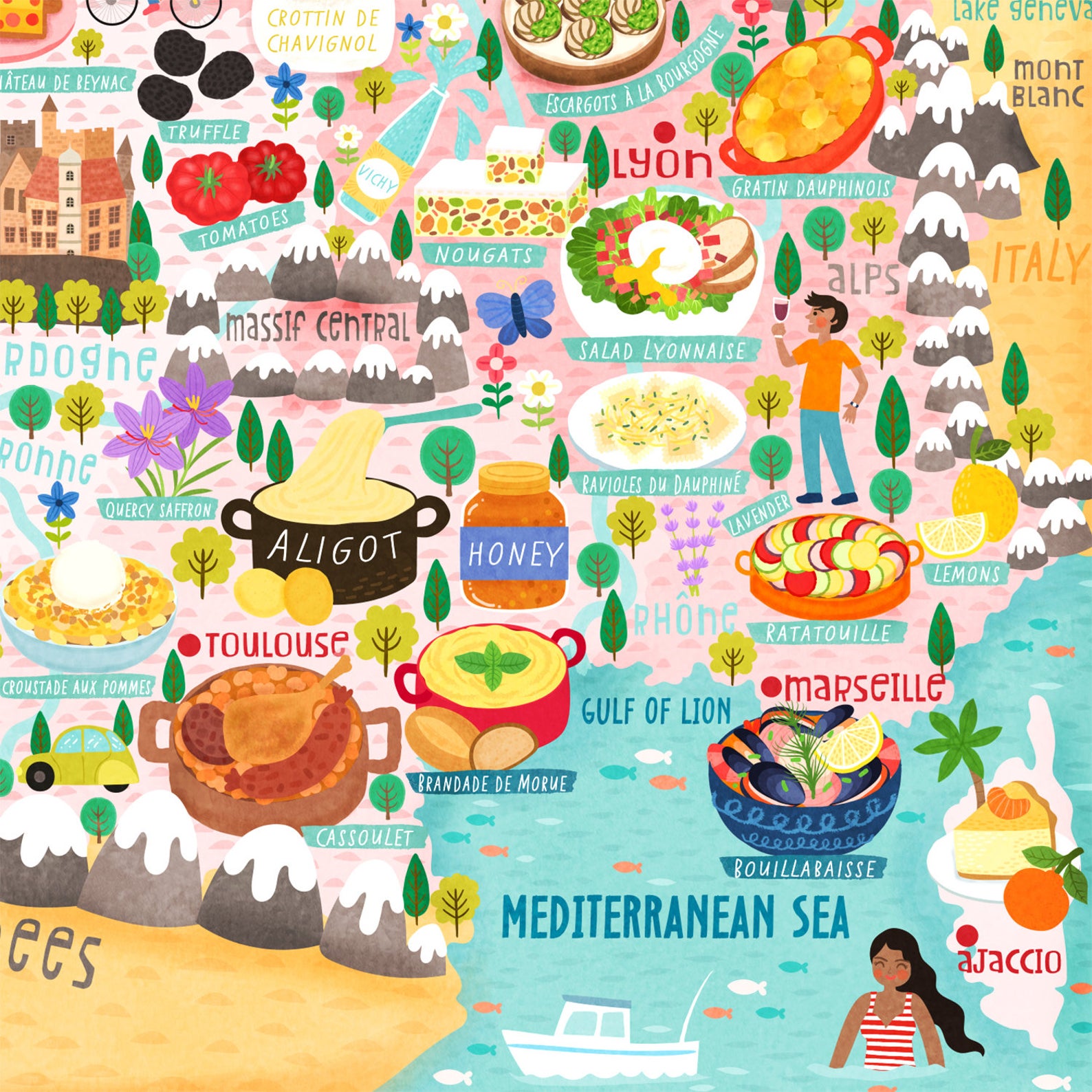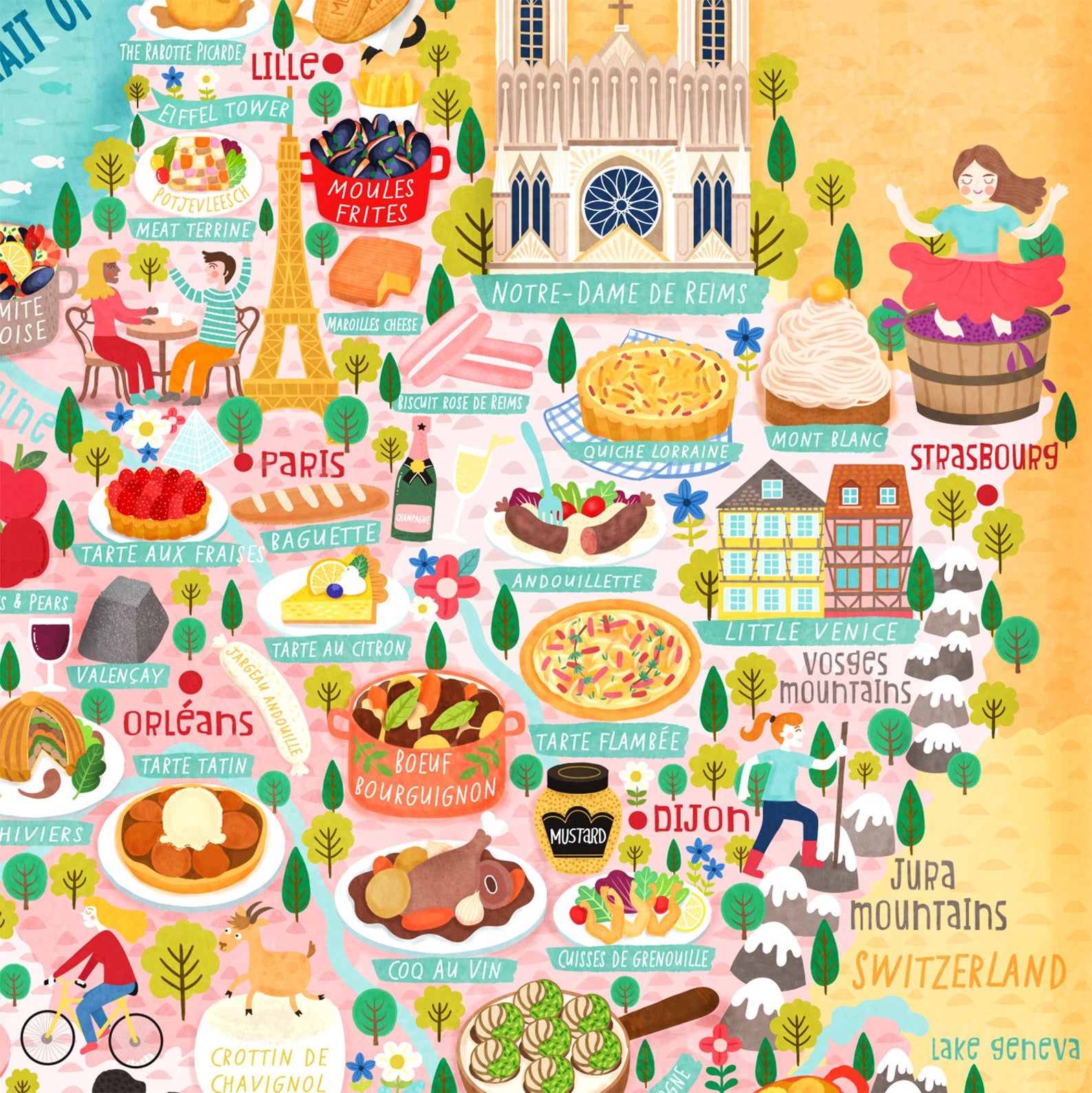As always I always like my maps to be really colourful and fun. There are lots of different regions, cities and fun things to see and as mentioned above lots of food. This is a really visually striking illustrated map of France.