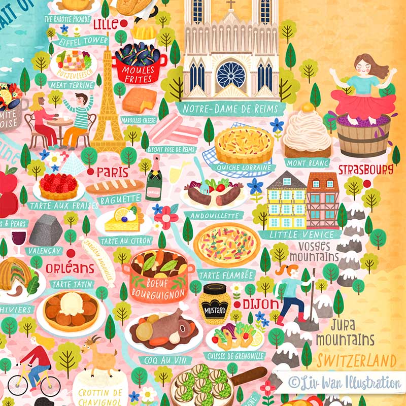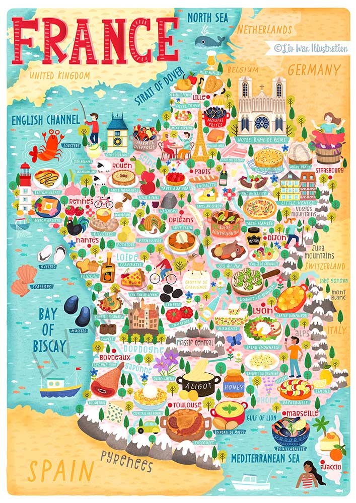 I’ve always wanted to illustrate a map of France because it’s such a beautiful country with equally beautiful food. I traveled around France very briefly a few years ago and I remember all of the delicious and beautiful French food I ate so since I started illustrating maps I’ve always wanted to illustrate France but over the last several years I’ve been crazy busy with work, so I’ve only now been able to create it.