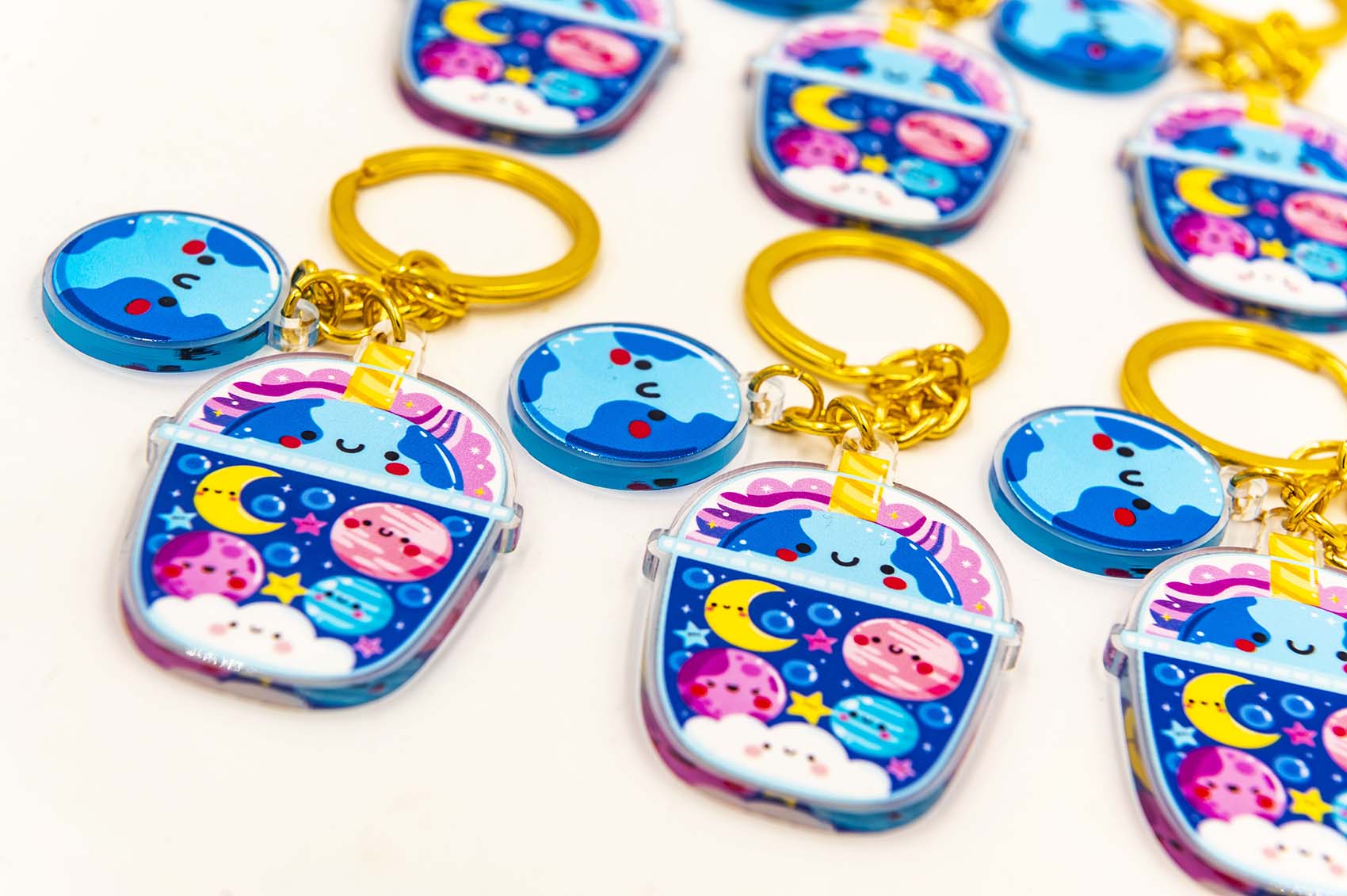 Brand new for 2023, I have created multiple keychains that are super fun and colourful. This Galaxy Bubble Tea Keychainis made from 100% recycled eco-friendly acrylic and measures 2.5 inches along its longest length. It comes supplied with a gold chain and an additional keychain charm attached.
