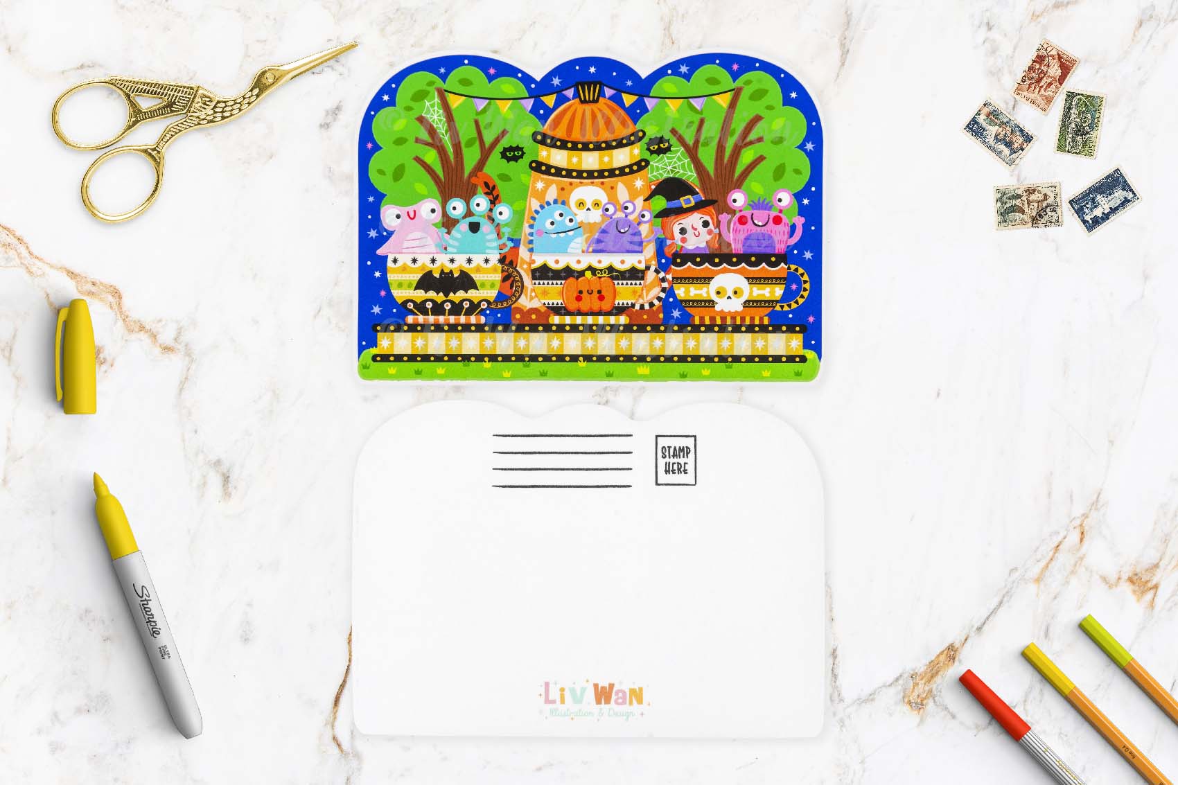 You can choose up to 8 cards from this Halloween Fairground Postcard Collection. There is one regular A6-sized postcard and all the other cards are shaped cut-out postcards. The shaped cards measure up to 5.6 inches along their longest edge, so almost exactly A6 in size, and each one has its own shape and character.
