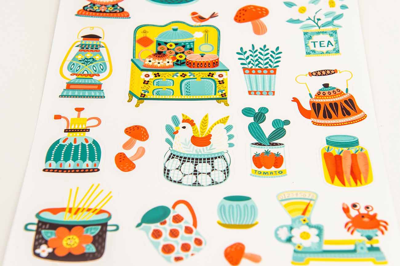 This listing is for a single 5×7 inches (12.7×17.8cm) sheet that includes 19 removable gloss stickers. Stickers range from 1.5 inches to 3 inches (the kitchen with the bird). The smaller stickers like the mushrooms start at 0.5 inches.