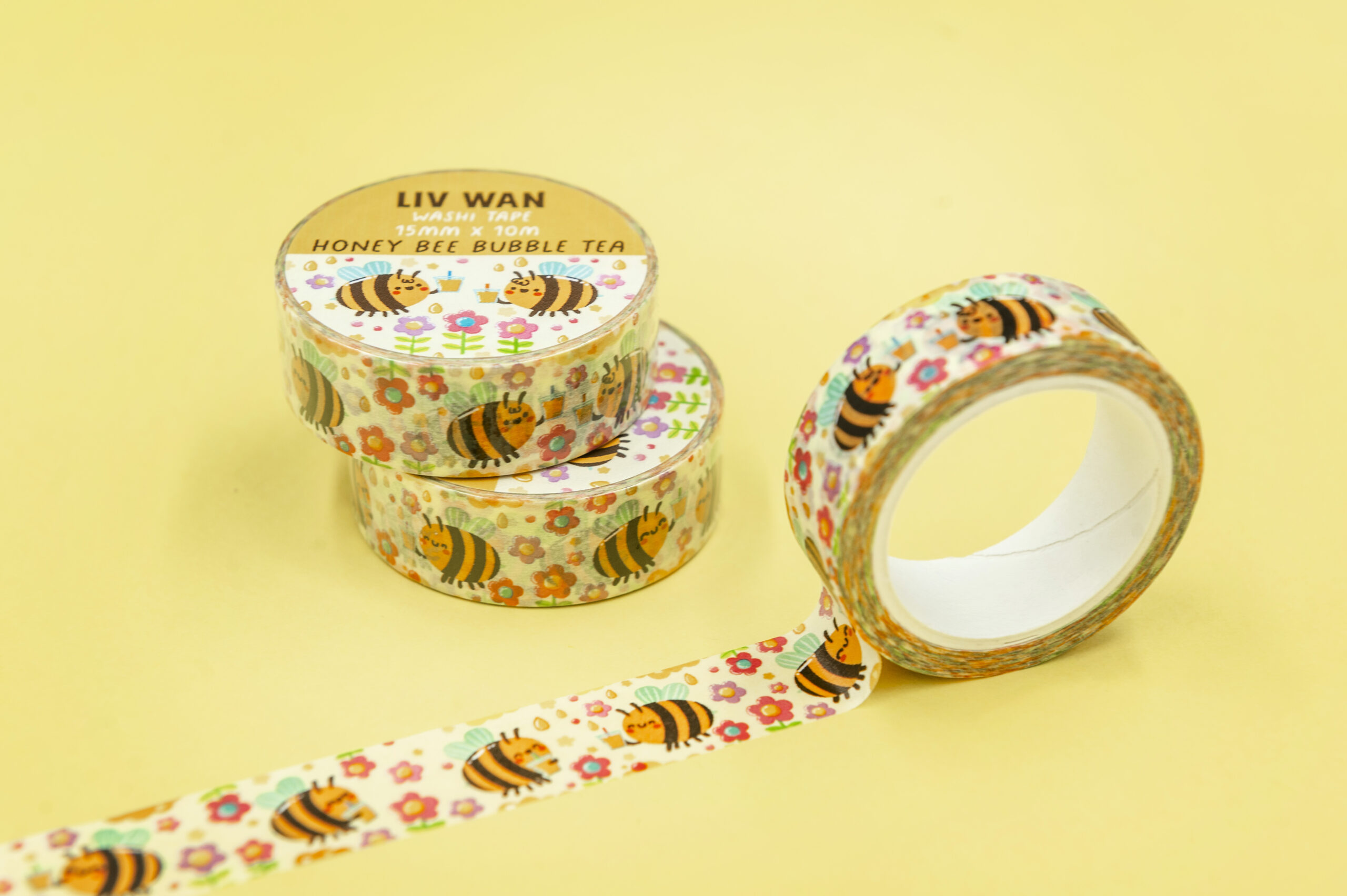 These are designed by myself in the UK but manufactured abroad. This Honey Bubble Tea Washi Tape has a semi-permanent adhesive coating that allows for some repositioning.