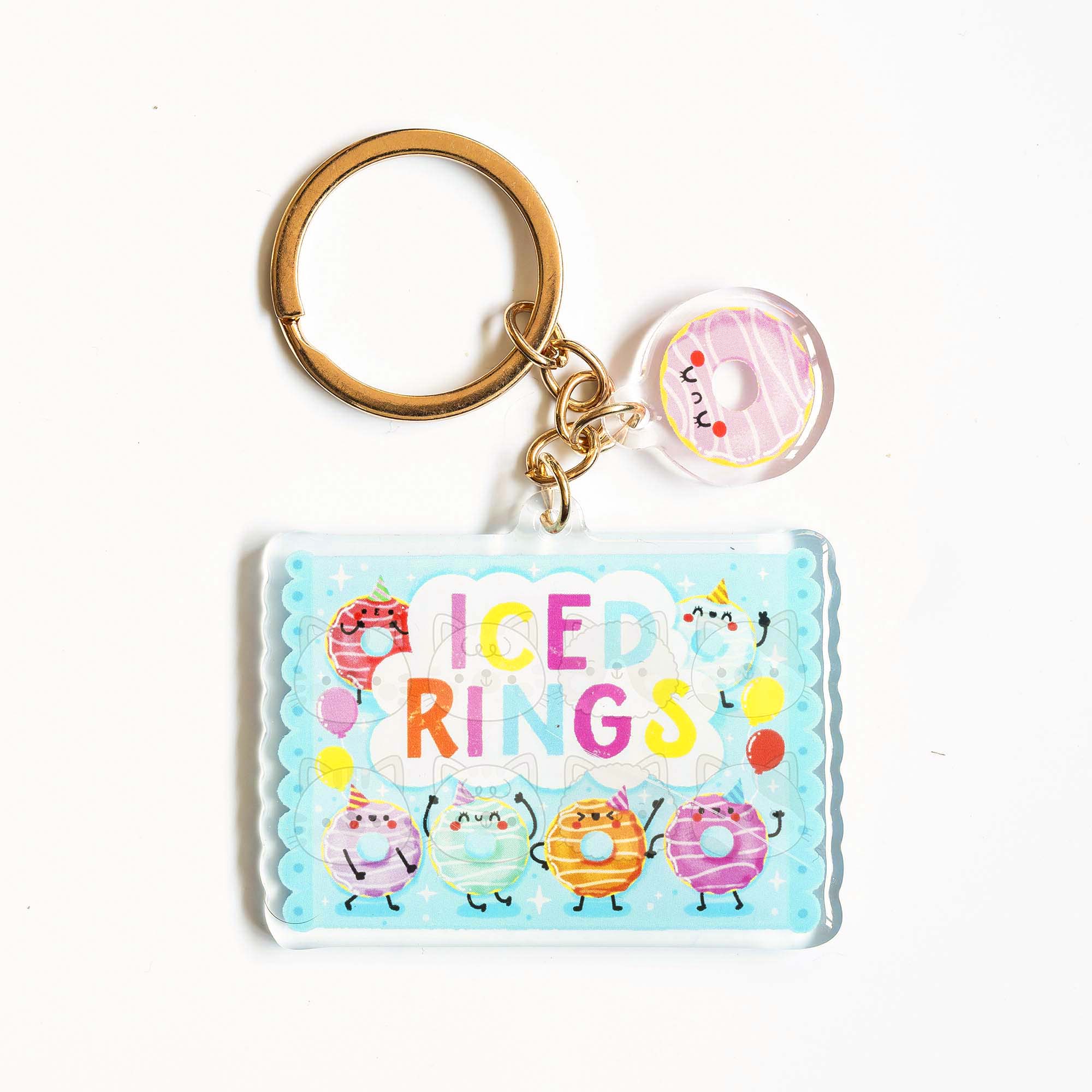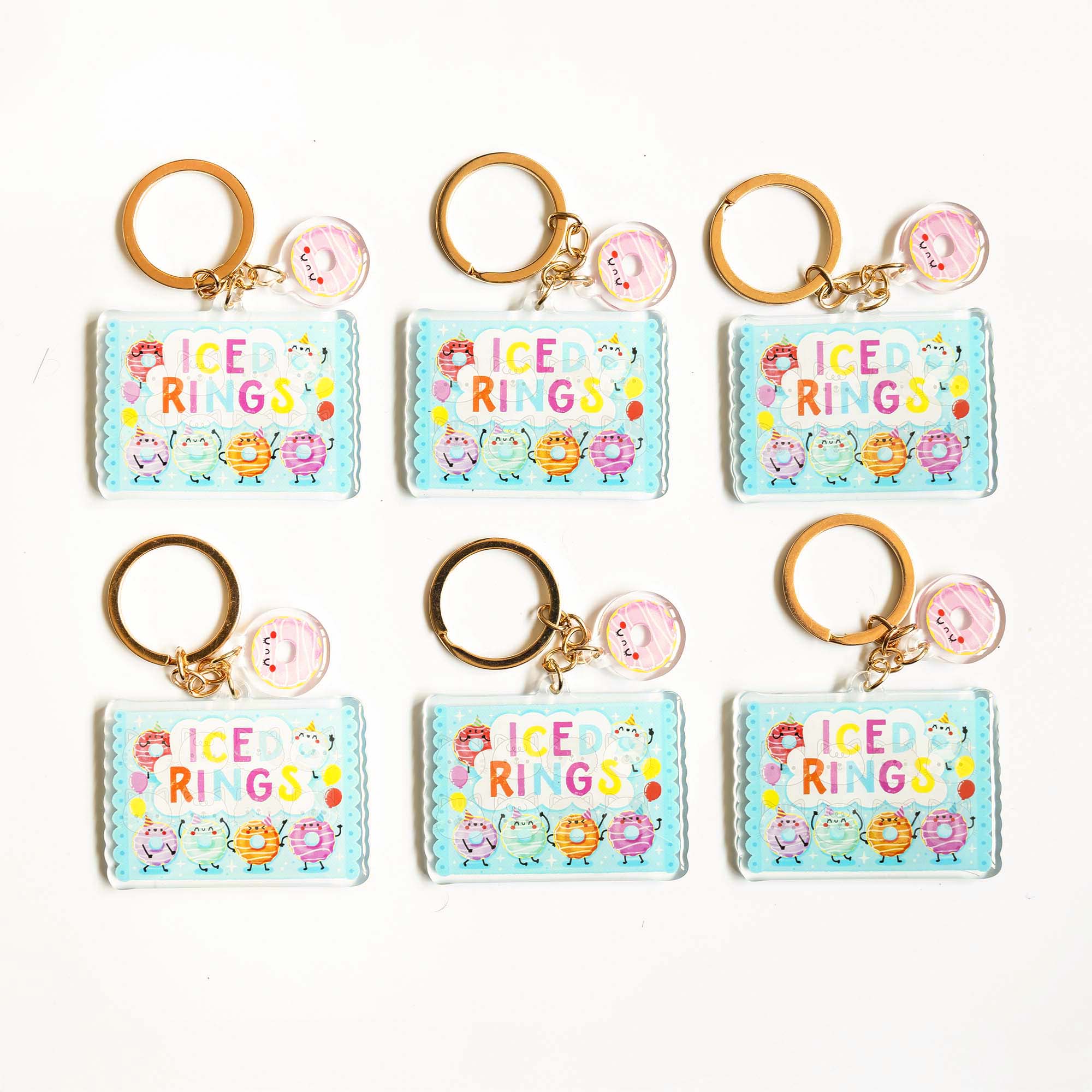 This Iced Rings Keychain is made from 100% recycled eco-friendly acrylic and measures 2.5 inches along its longest length. It comes supplied with a gold chain and an additional keychain charm attached.