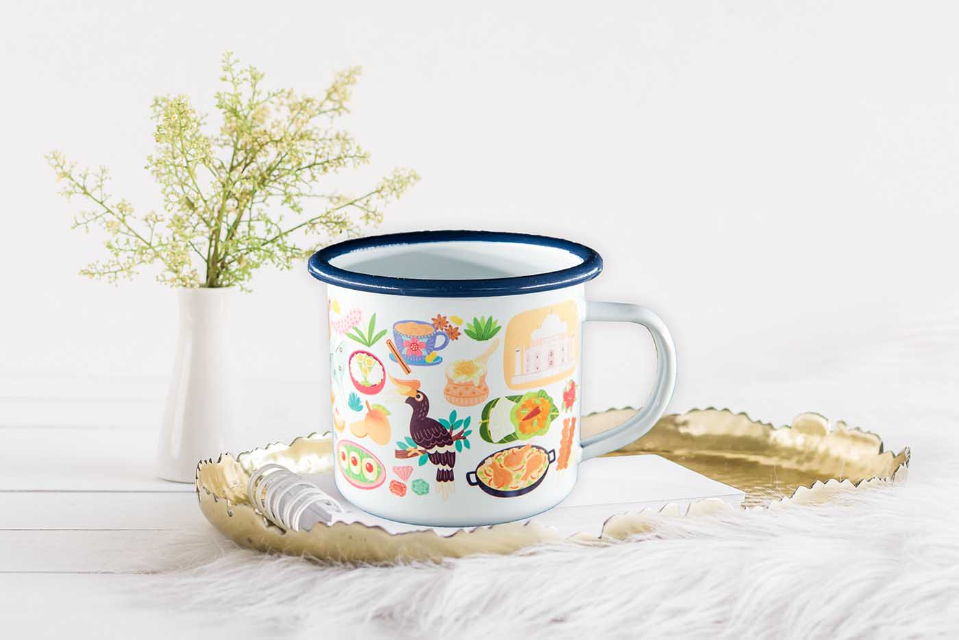 Recently I created a brand new map of India and made three products from it; a poster, a postcard, and a jigsaw puzzle. My fourth India product is an India enamel mug that features lots of my favourite things from the map I created.