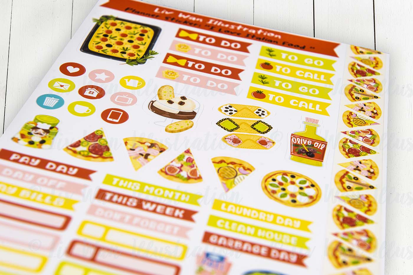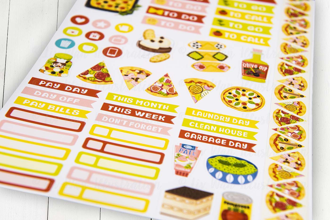 Listing is for a single Italian Food Planner Sticker Sheet sized 6×9 inch sheet and includes 51 removable matte stickers.