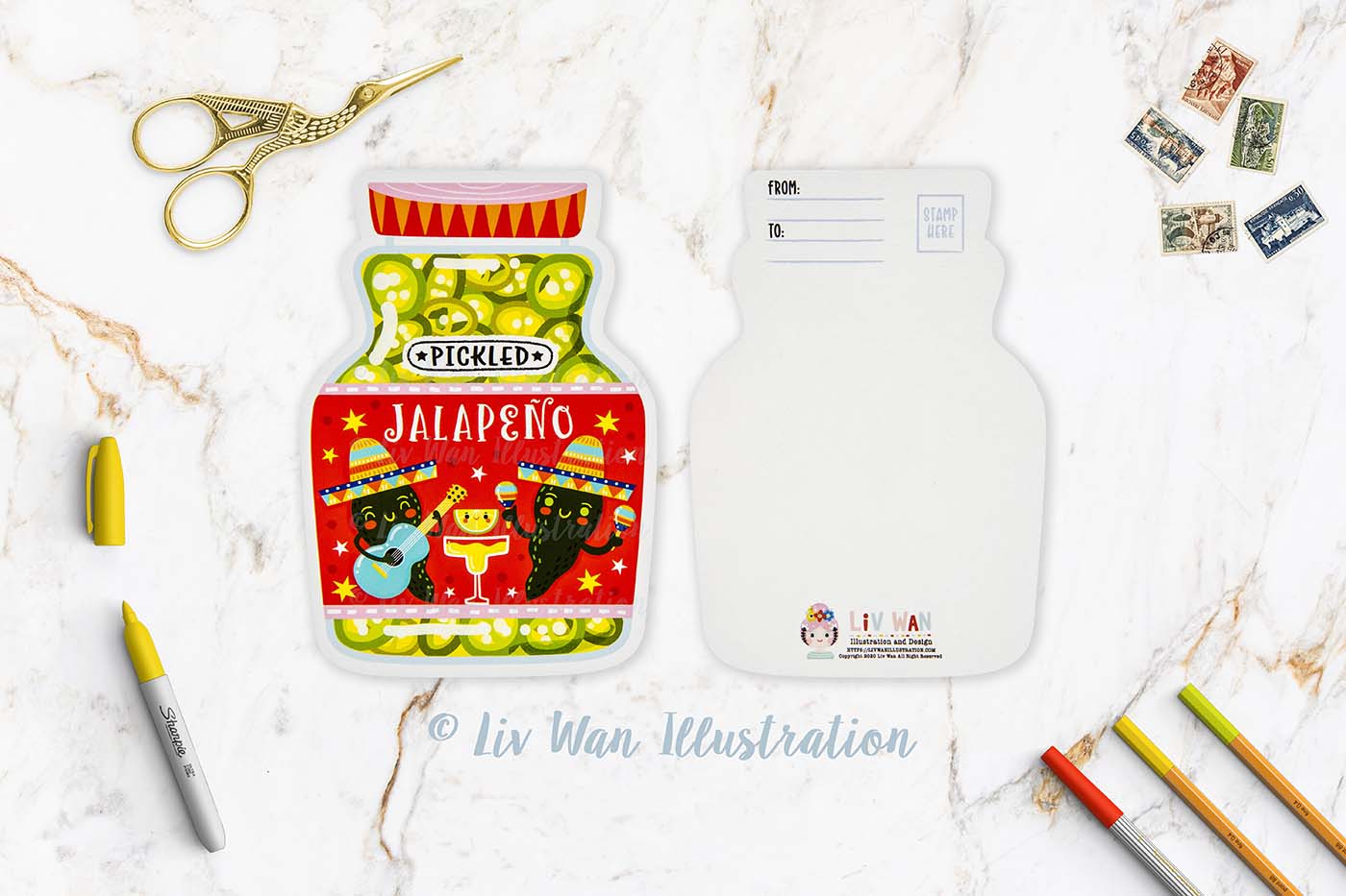 Jalapeno Postcard. Really fun A6 5.8″ tall shaped postcard. I love a good condiment and this card is one of 21 condiment postcards. 20 of these postcards are shaped postcards.