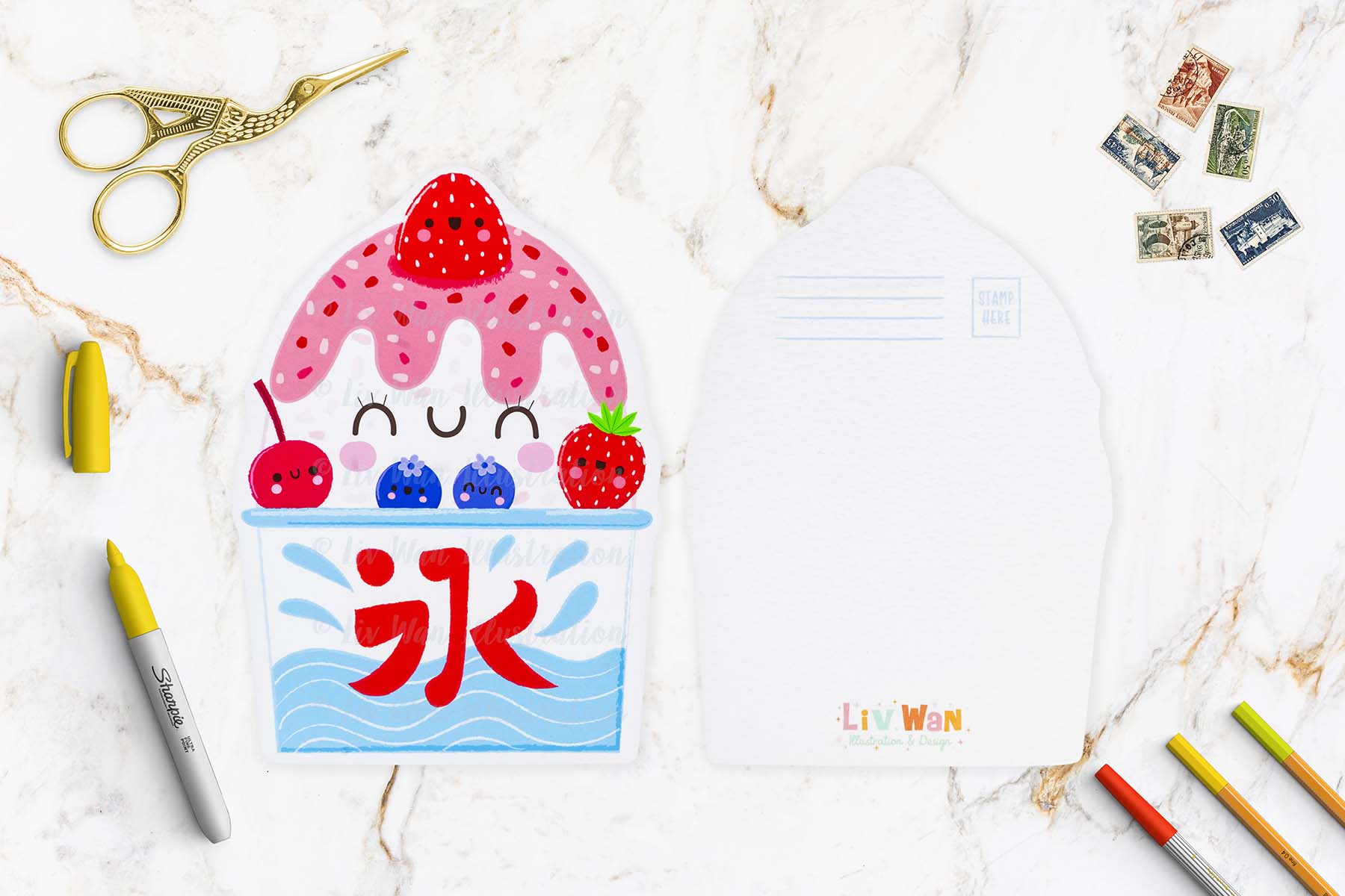 This Kawaii Kakigori Postcard is A6 (10.5 × 14.8cm) in size and is printed on a beautiful heavyweight fine-art textured paper by myself, which provides beautiful colours, contrast, texture and is a joy to write on. This is a die-cut postcard which I have expertly cut out myself using a commercial plotter cutter. These are really expensive but ensure the lines are cut perfectly and everything is exactly the same size.