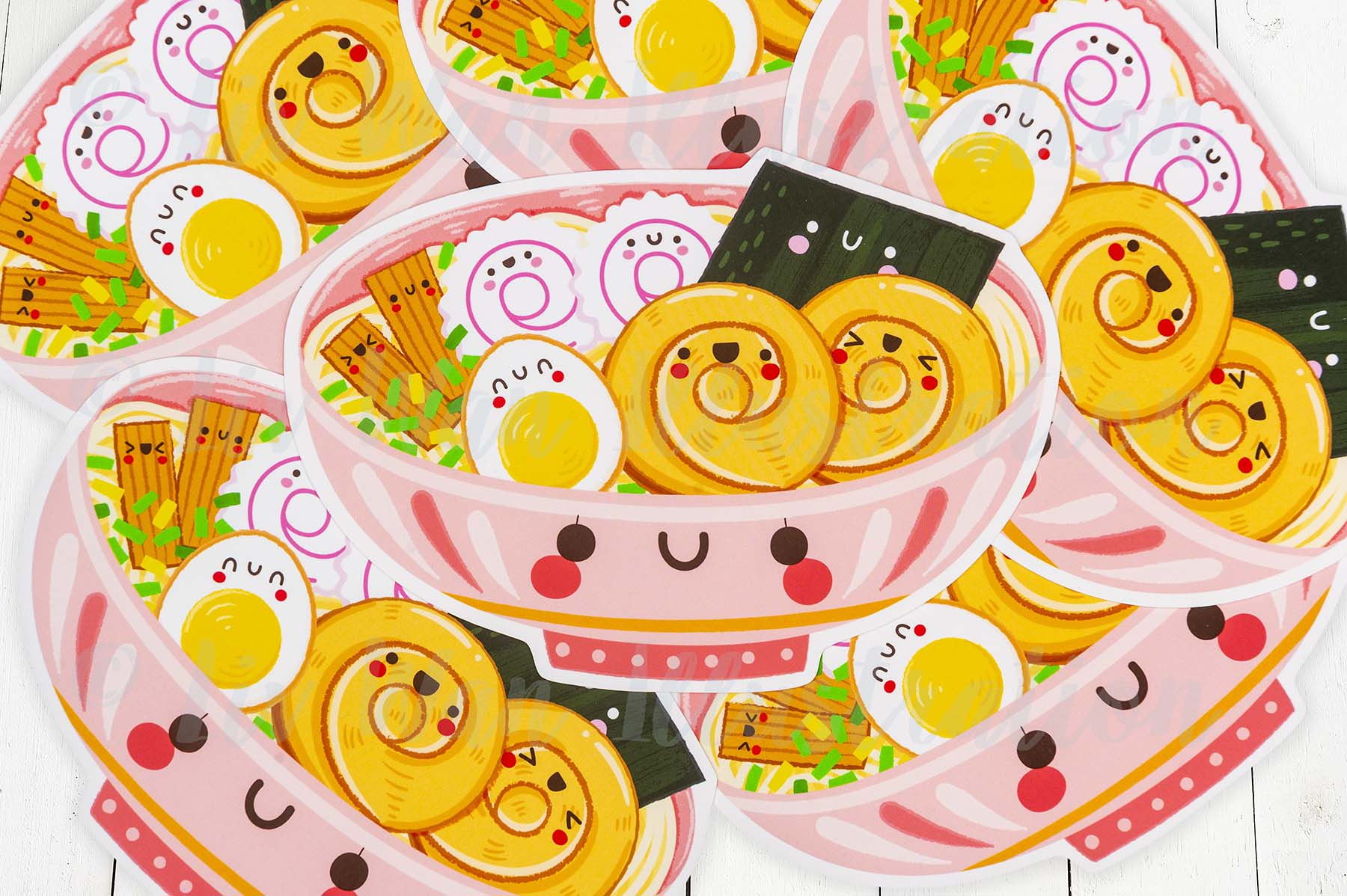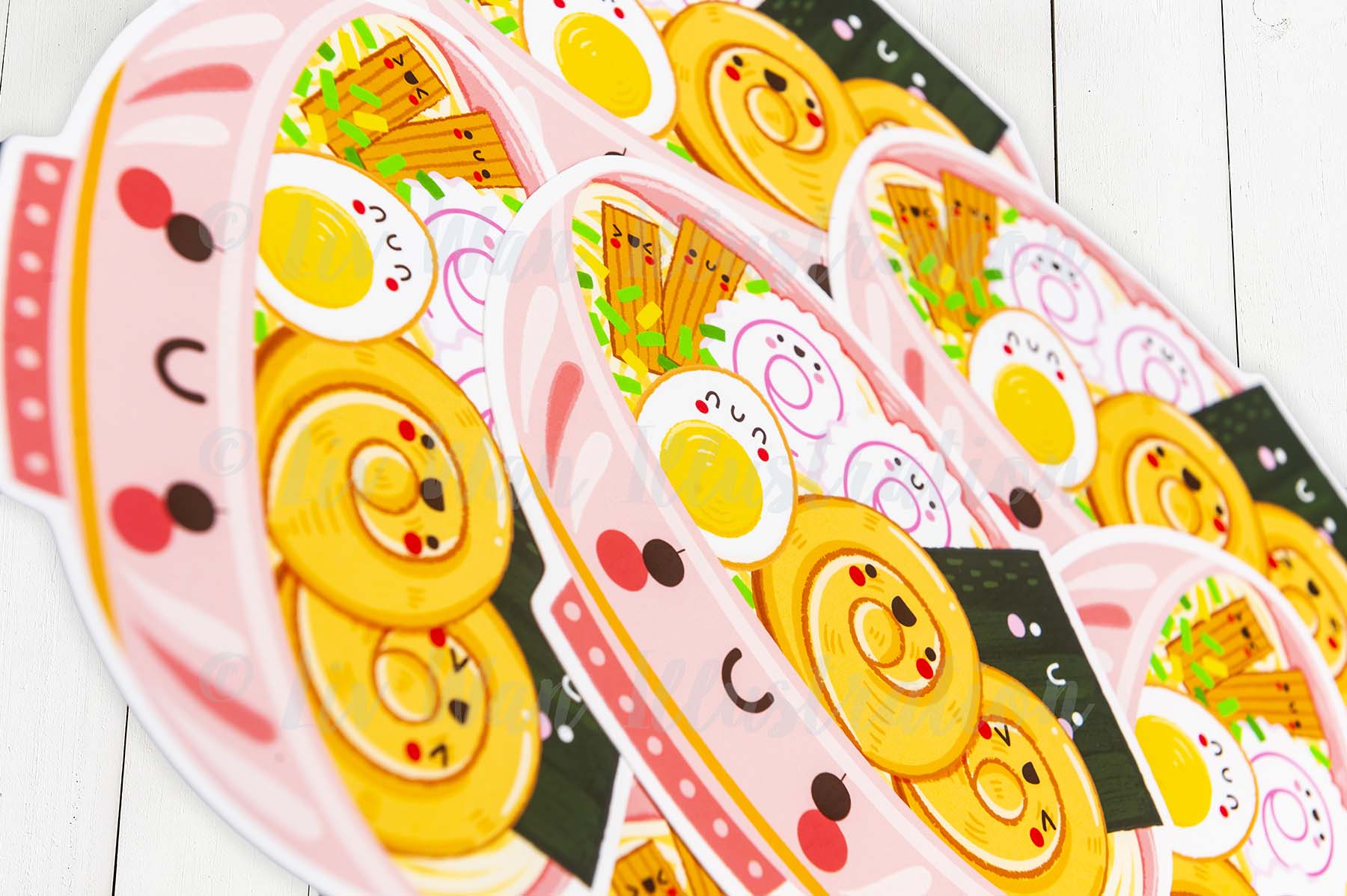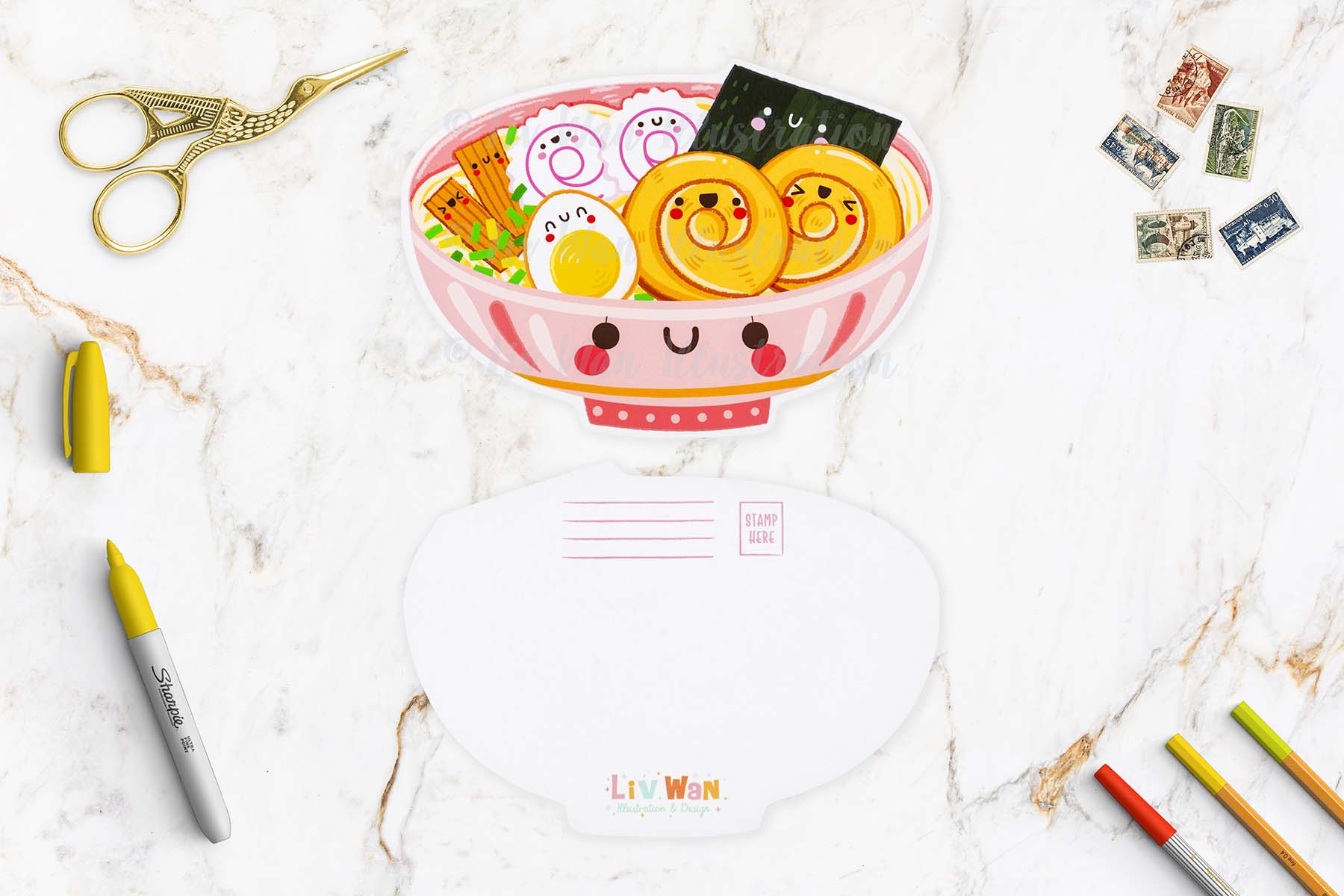This Kawaii Ramen Postcard is A6 (10.5 × 14.8cm) in size and is printed on a beautiful heavyweight fine-art textured paper by myself, which provides beautiful colours, contrast, texture and is a joy to write on. This is a die-cut postcard which I have expertly cut out myself using a commercial plotter cutter. These are really expensive but ensure the lines are cut perfectly and everything is exactly the same size.