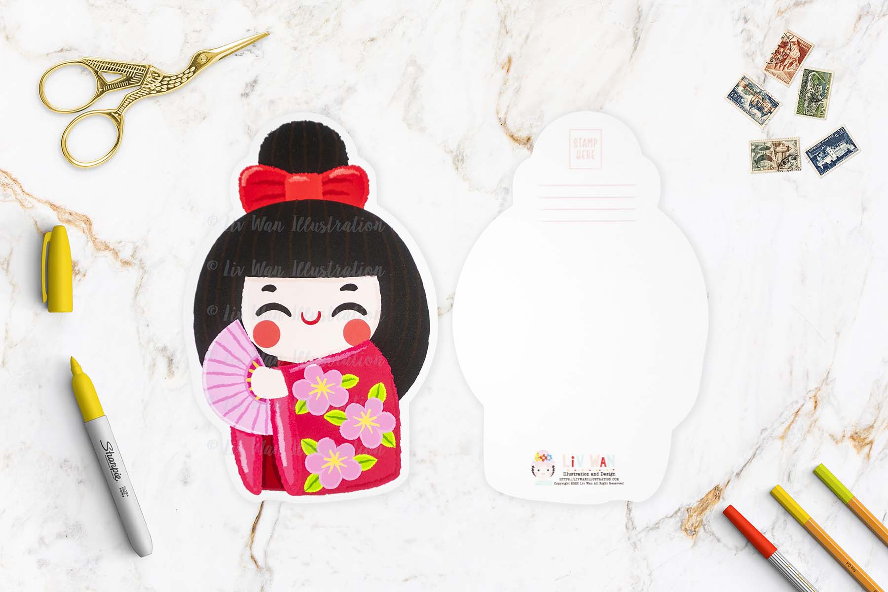 Kimono Girl Postcard. Summer 2025 I participated in a Japanese themed convention so I created five die-cut shaped postcards for this, one of which includes this Kimono Girl Postcard.