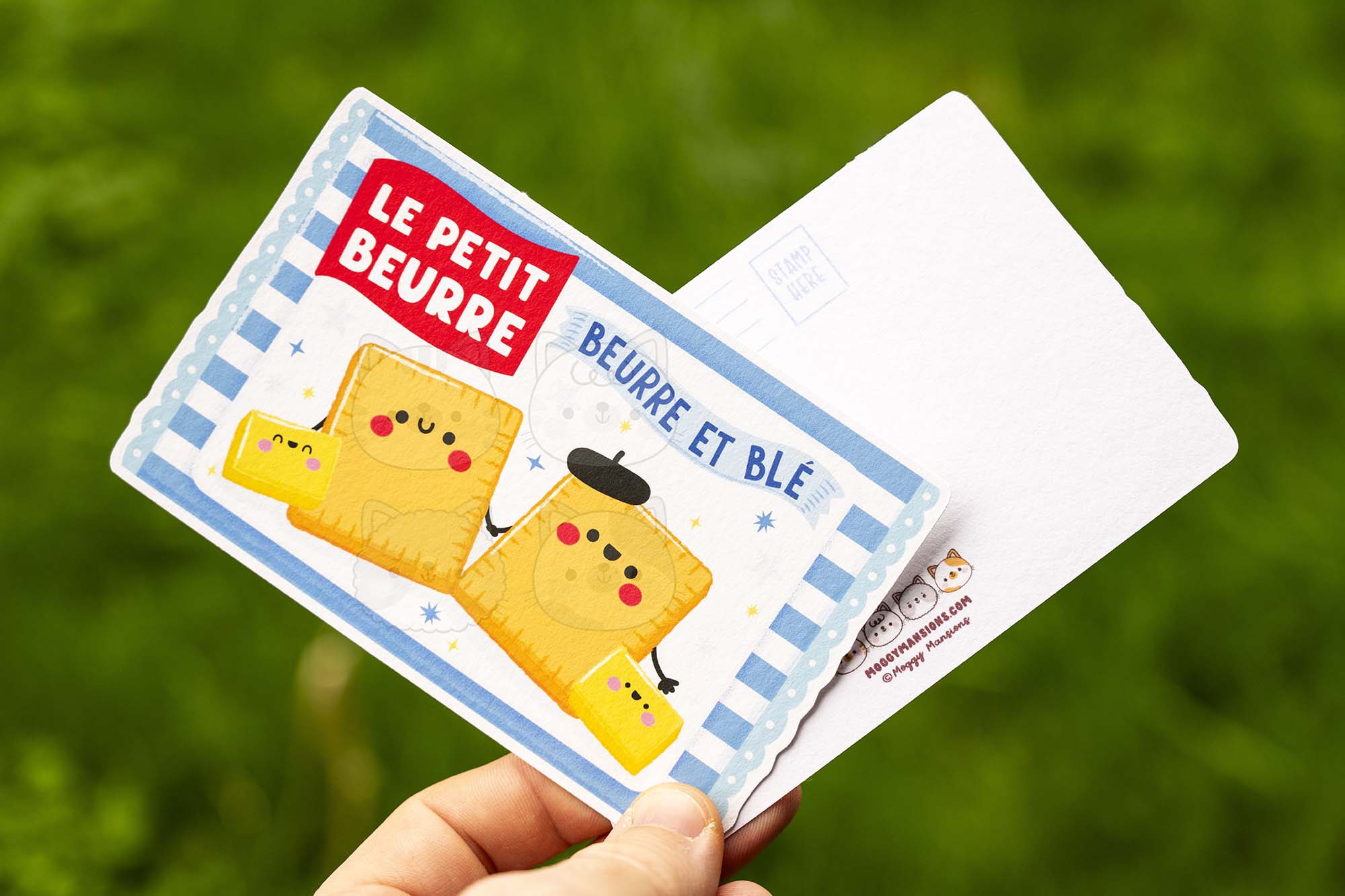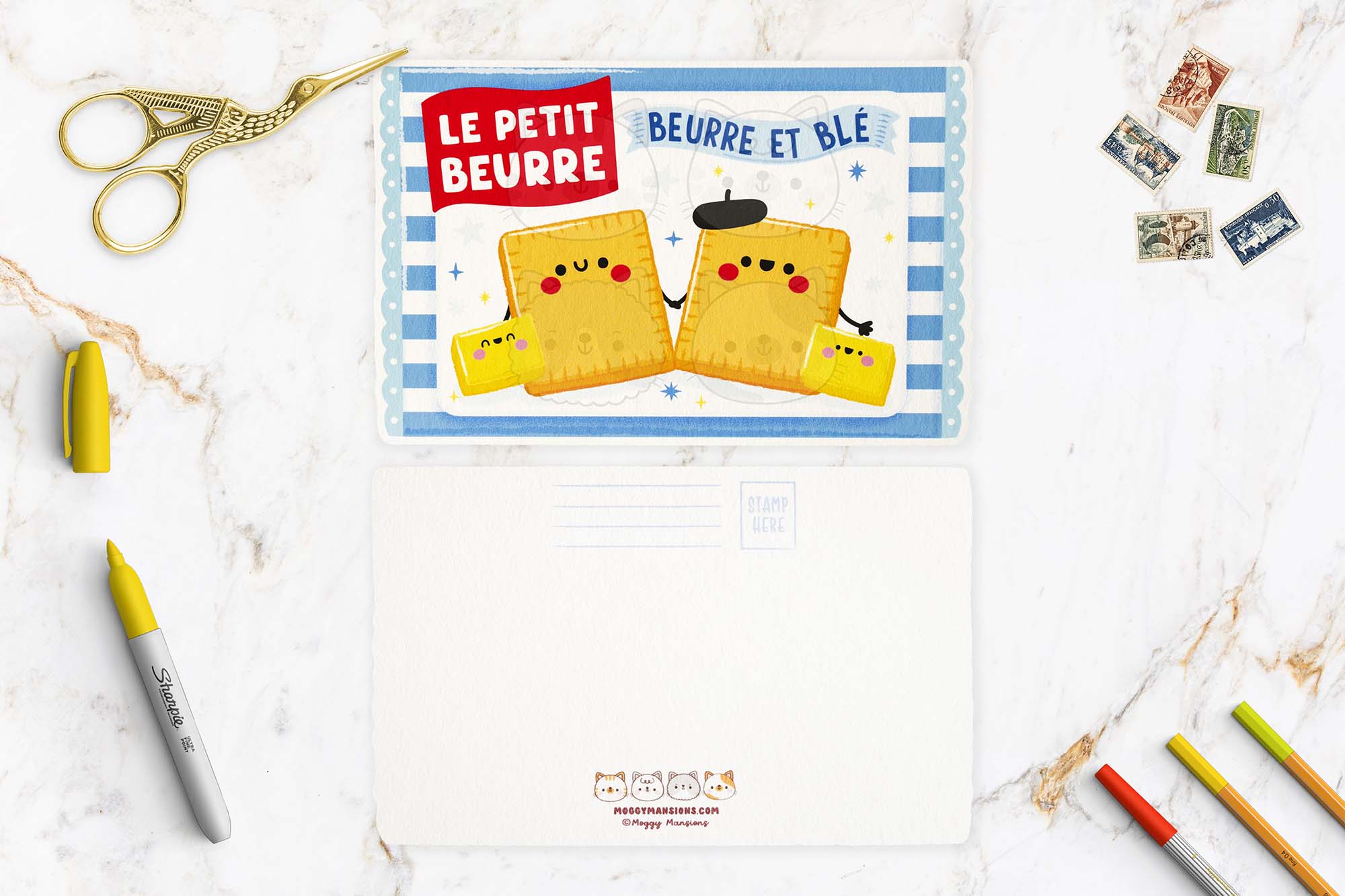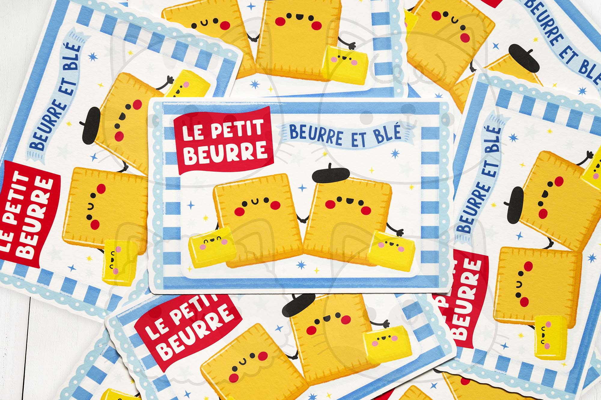 Introducing our Le Petit Beuerre Postcard. For 2026 we’ll be trading at two major conventions in France so we’ve designed and made a small colletion of French food postcards. This fun A6 5.6″ tall Le Petit Beuerre Postcard is one of these postcards but has also been included in my pantry collection.