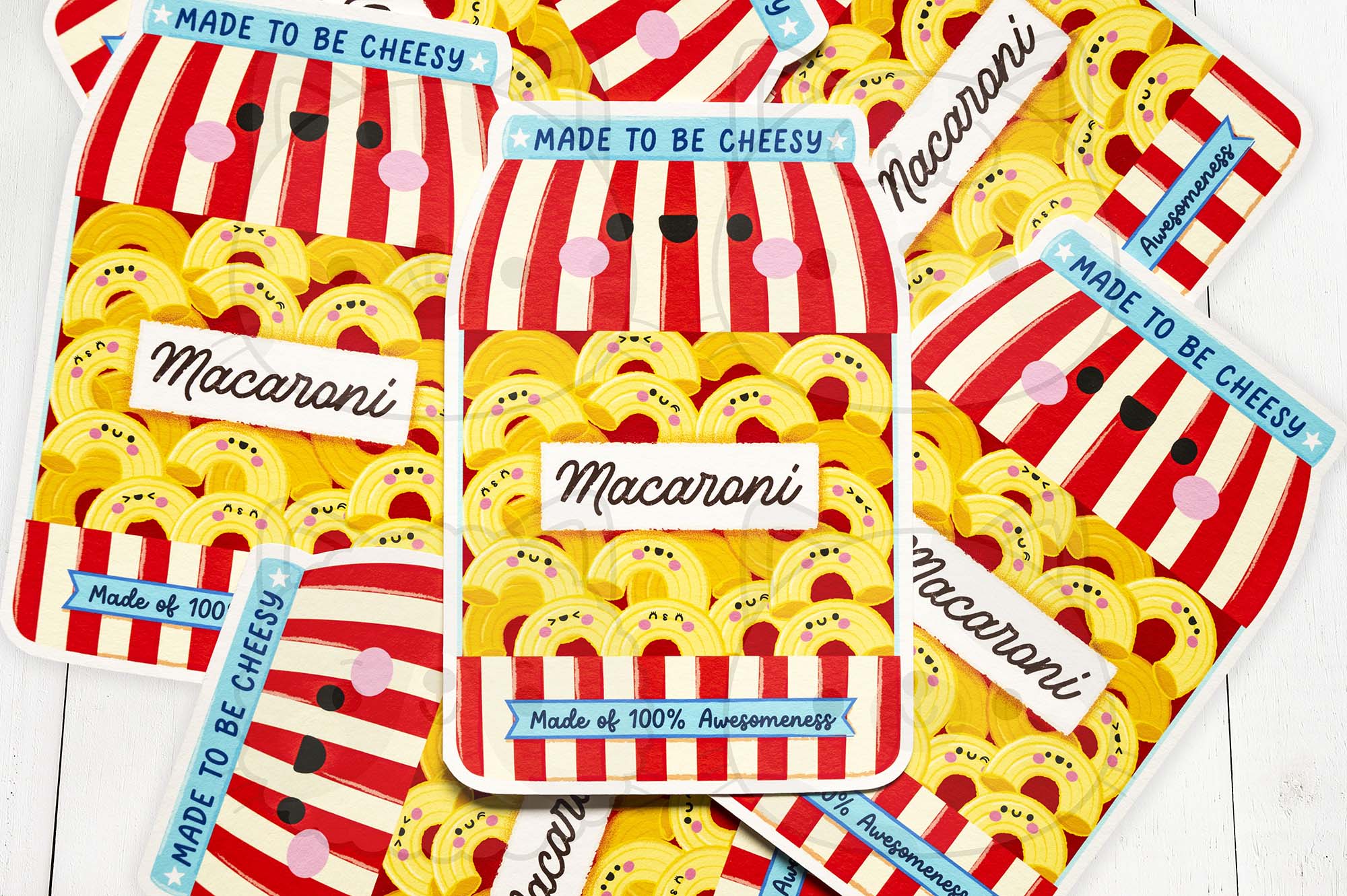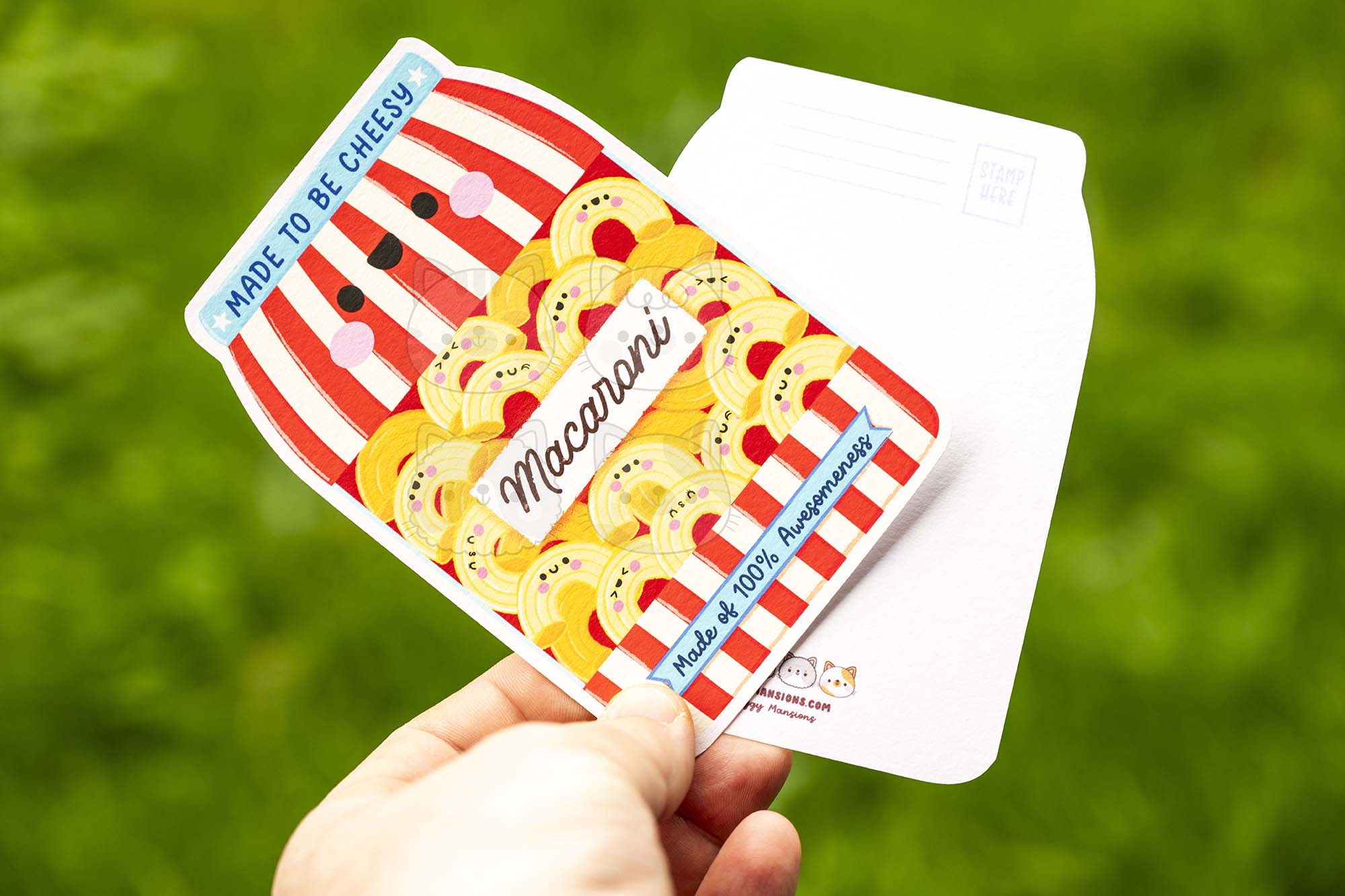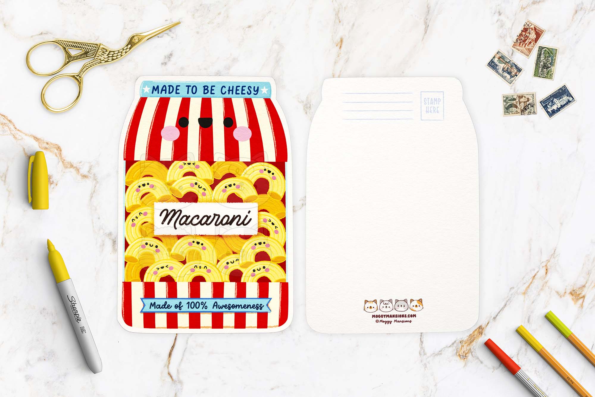 Introducing our Macaroni Postcard. In 2024 we created a collection of really fun die-cut shaped pantry postcards and we’ve wanted to extend this collection for some time, so beginning of 2026 this is one of a few new postcards for this collection.