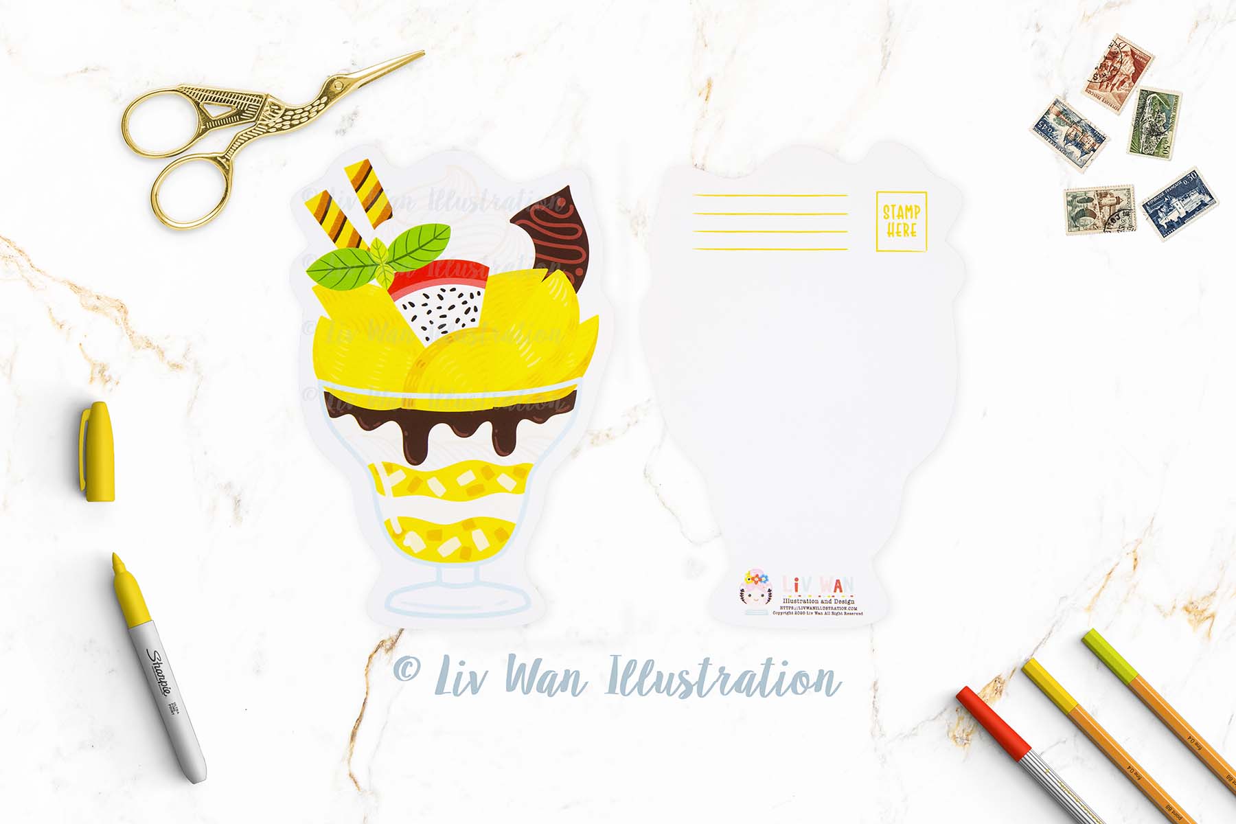This really fun Mango Ice Cream Sundae Postcard measures 5.6 x 4 inches, so A6 in size, and has been printed by Moggy Mansions on beautiful heavyweight cotton rag paper. This is a fine-art paper that has a beautiful texture, great colour reproduction and perhaps most importantly is absolutely lovely to write on.
