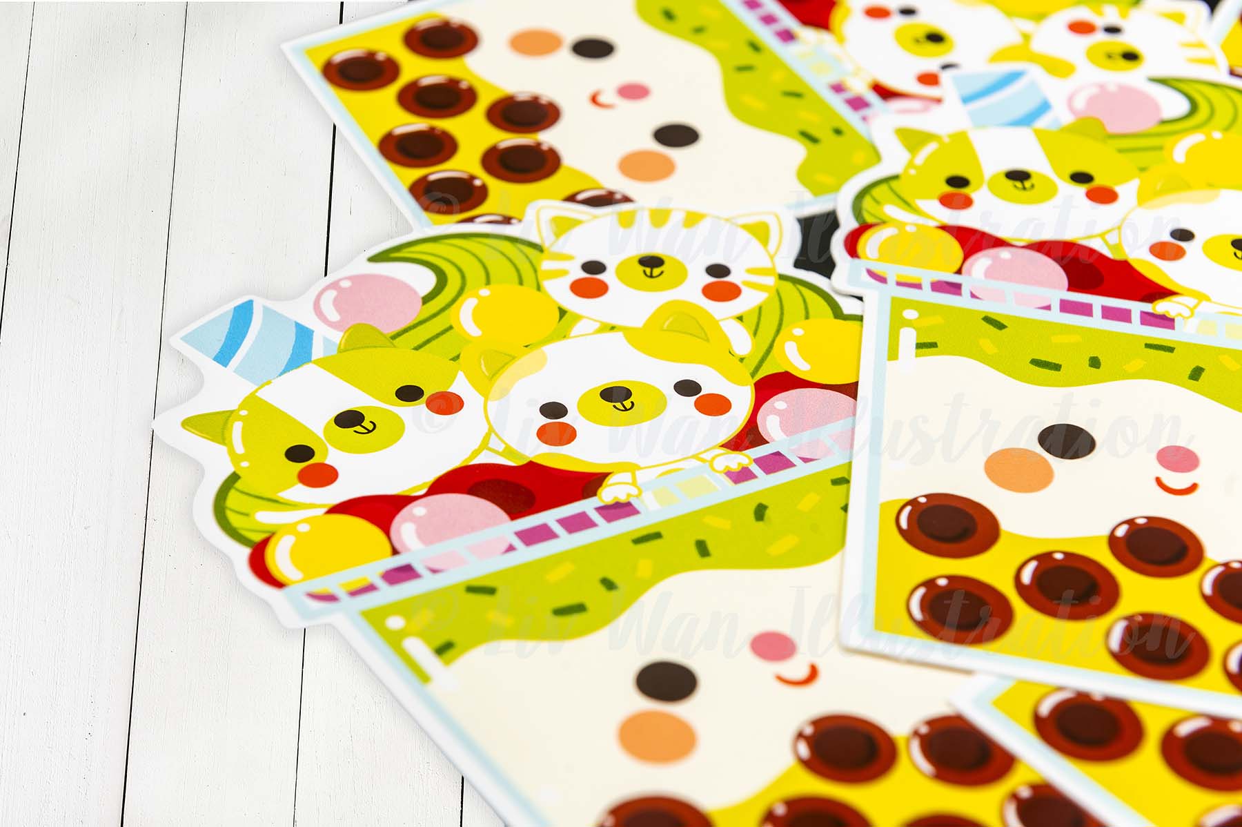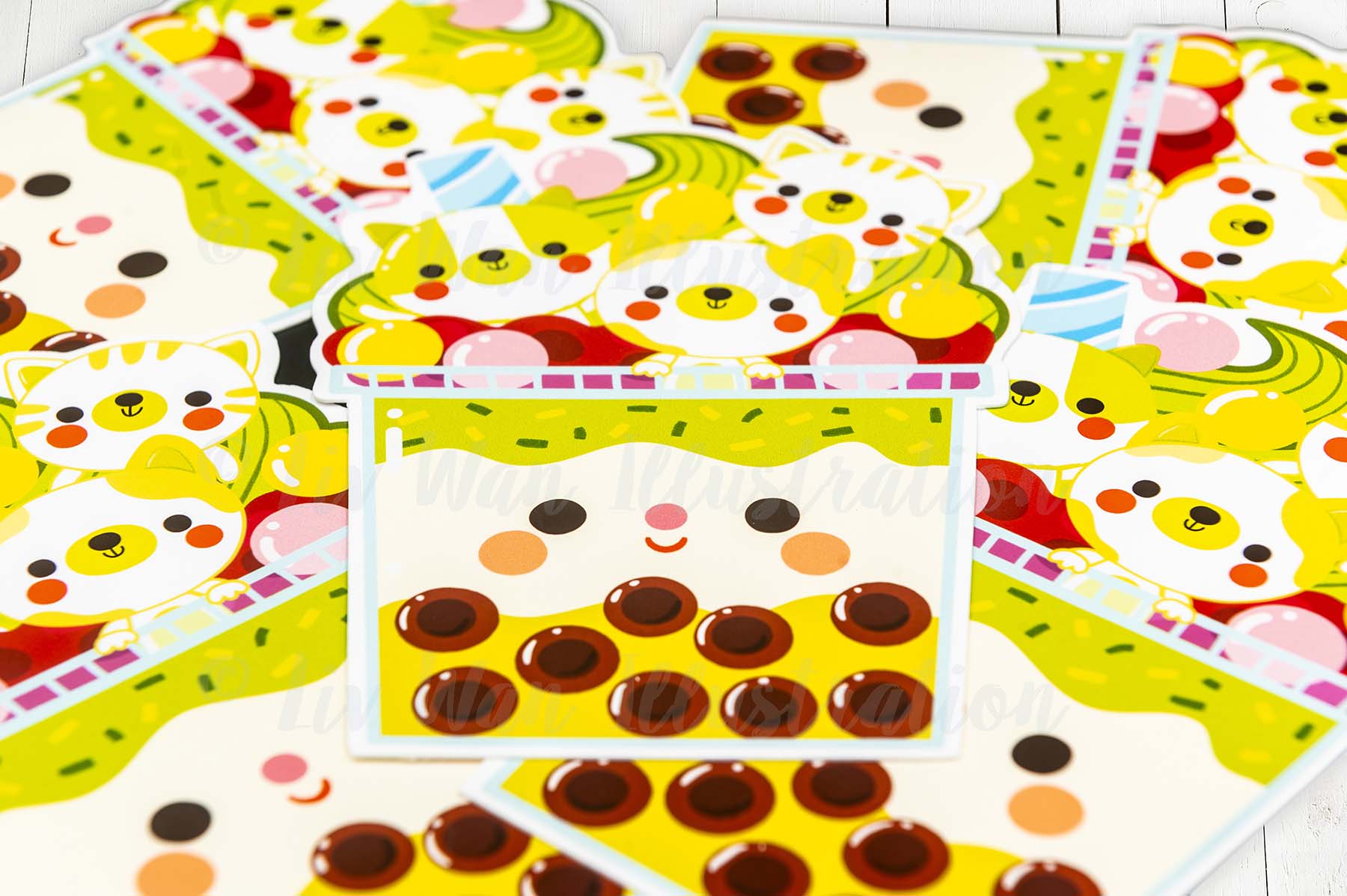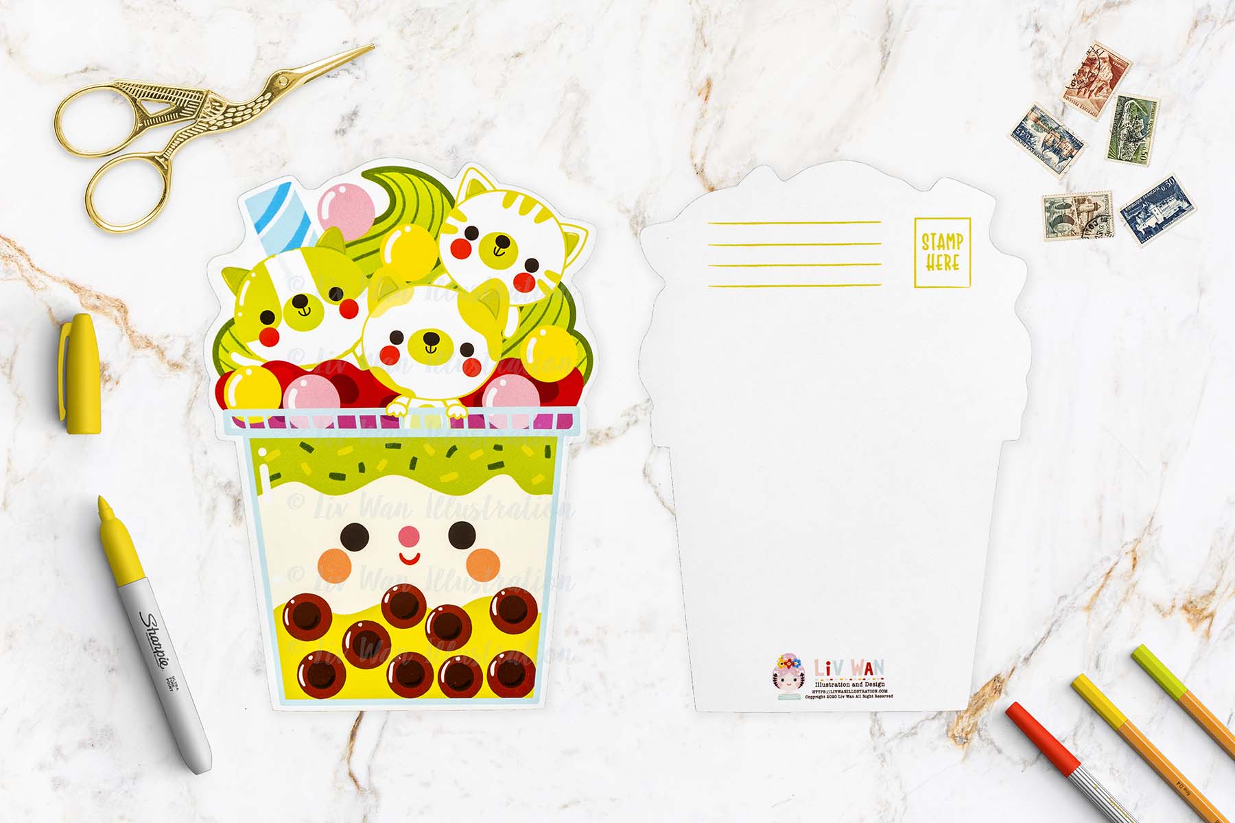 Brand new for summer 2023, I have created 14 super creative bubble tea postcards. I’m from Taiwan and have been drinking bubble tea for as long as I can remember, so combining my love of bubble tea, animals, colours and fun-related things, I made this Matcha Kitties Bubble Tea Postcard.