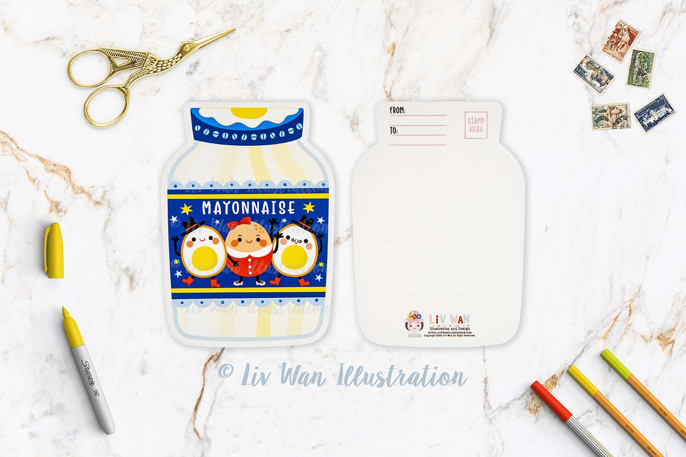 Mayonnaise Postcard. Really fun A6 5.8″ tall shaped postcard. I love a good condiment and this card is one of 21 condiment postcards. 20 of these postcards are shaped postcards.