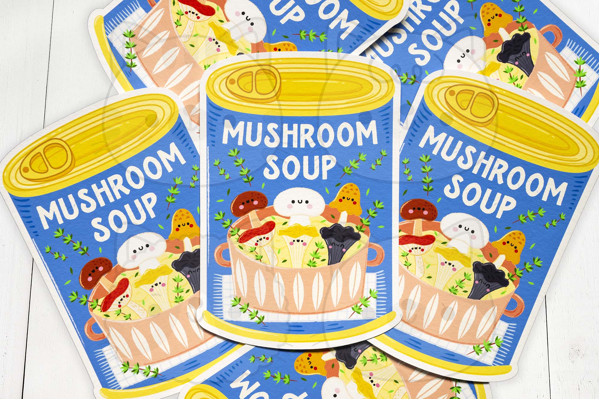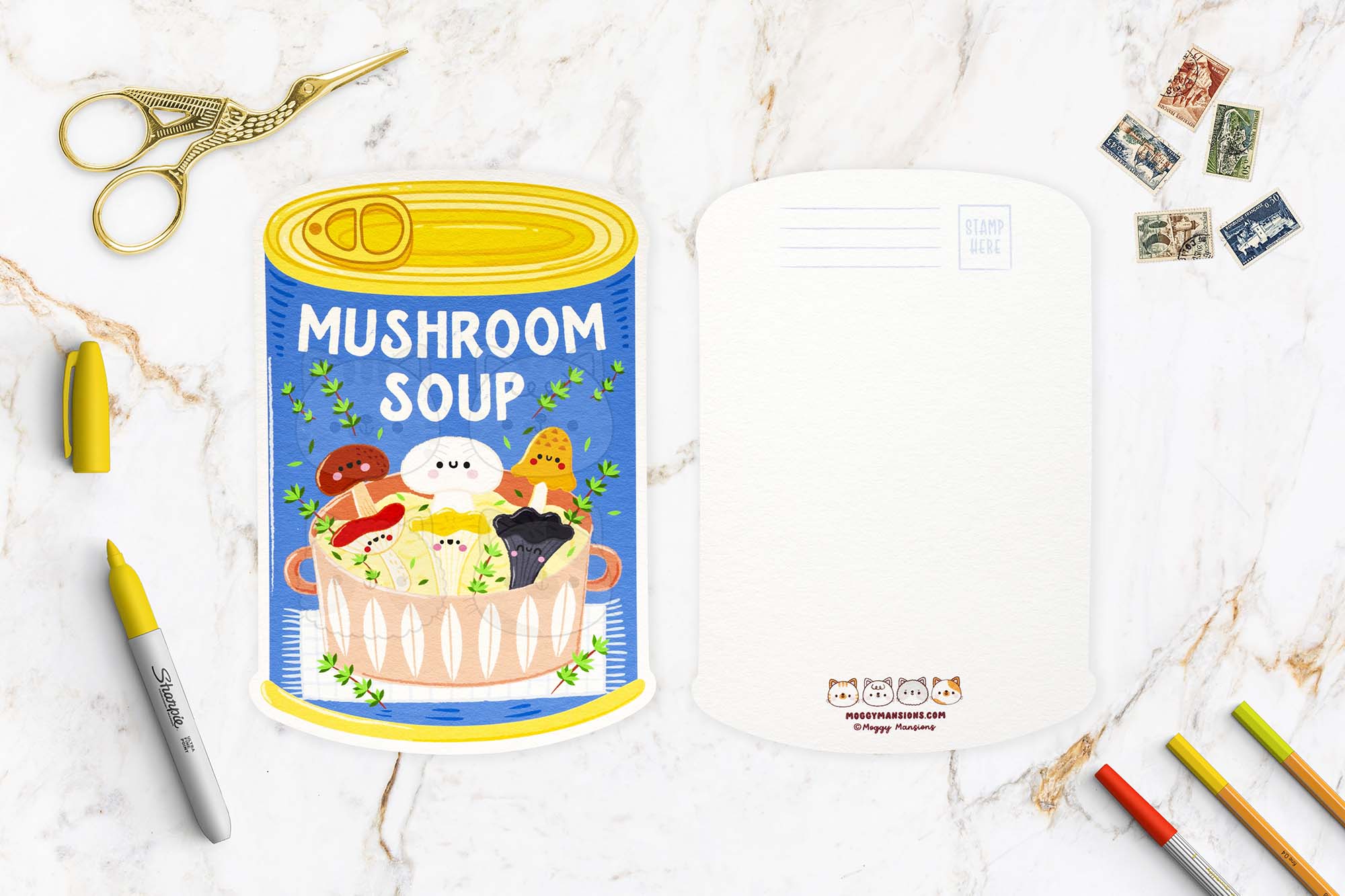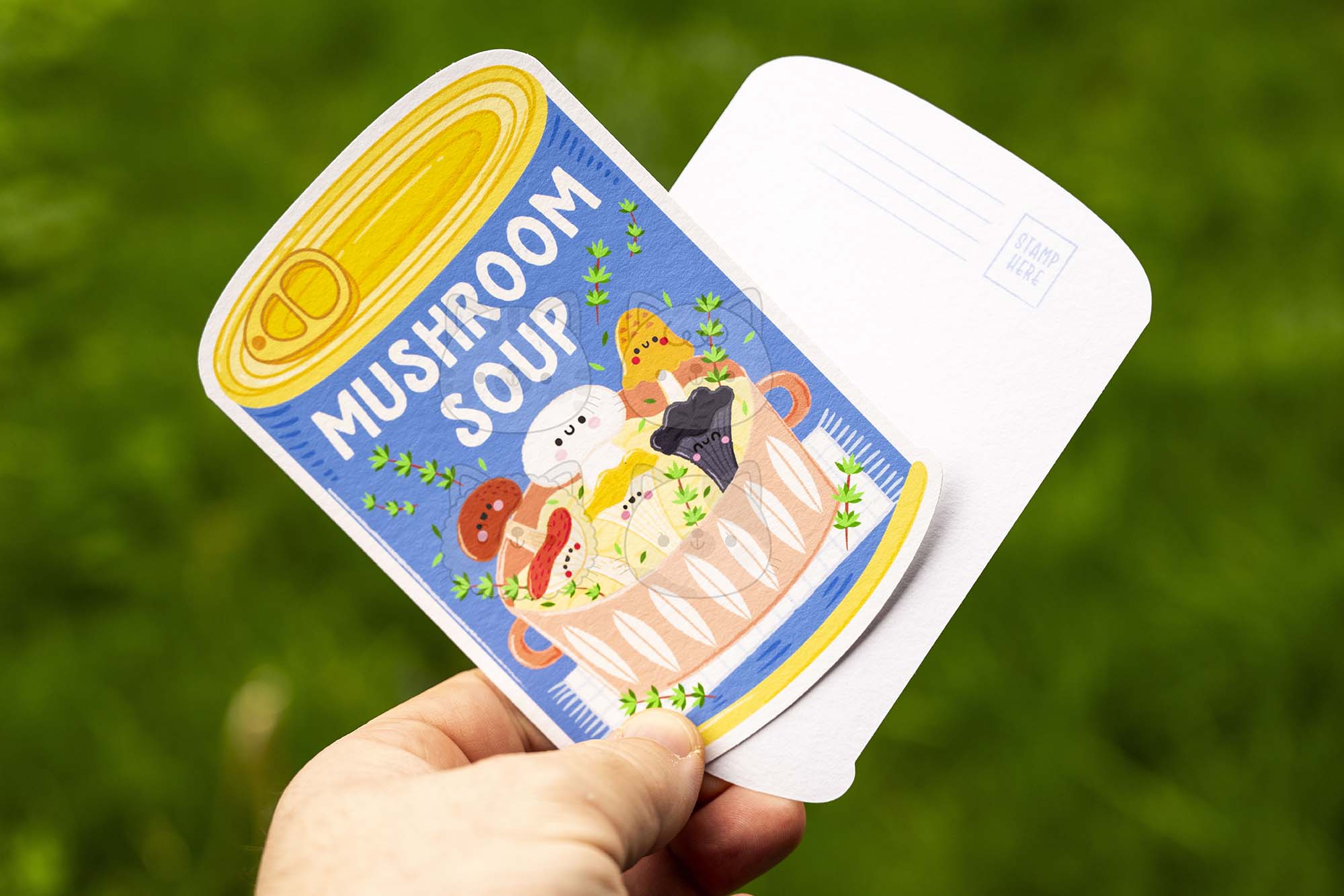 Introducing our Mushroom Soup Postcard. In 2024 we created a collection of really fun die-cut shaped pantry postcards and we’ve wanted to extend this collection for some time, so beginning of 2026 this is one of a few new postcards for this collection.