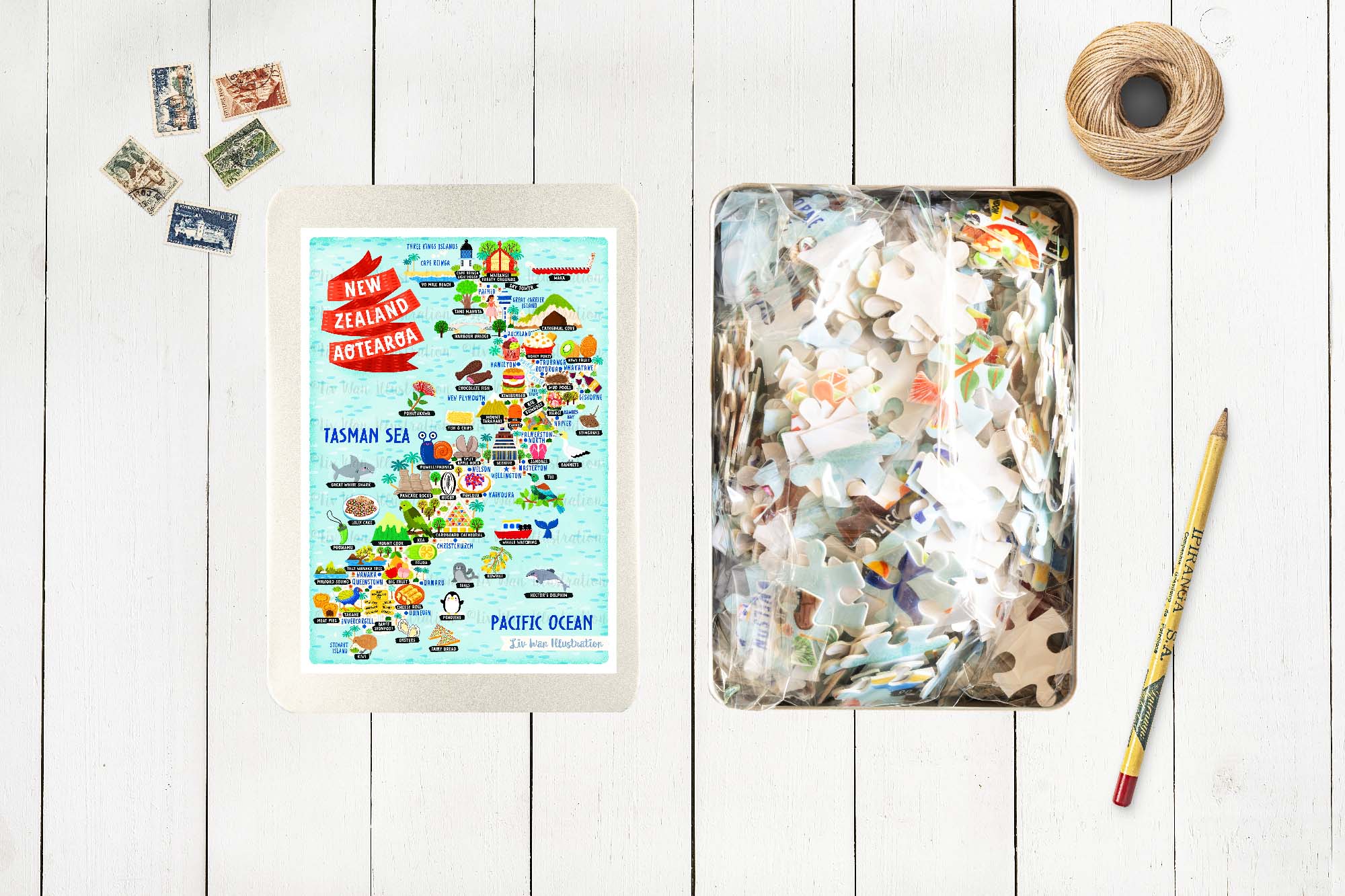 This New Zealand map puzzle comes supplied in a cute metal tin.