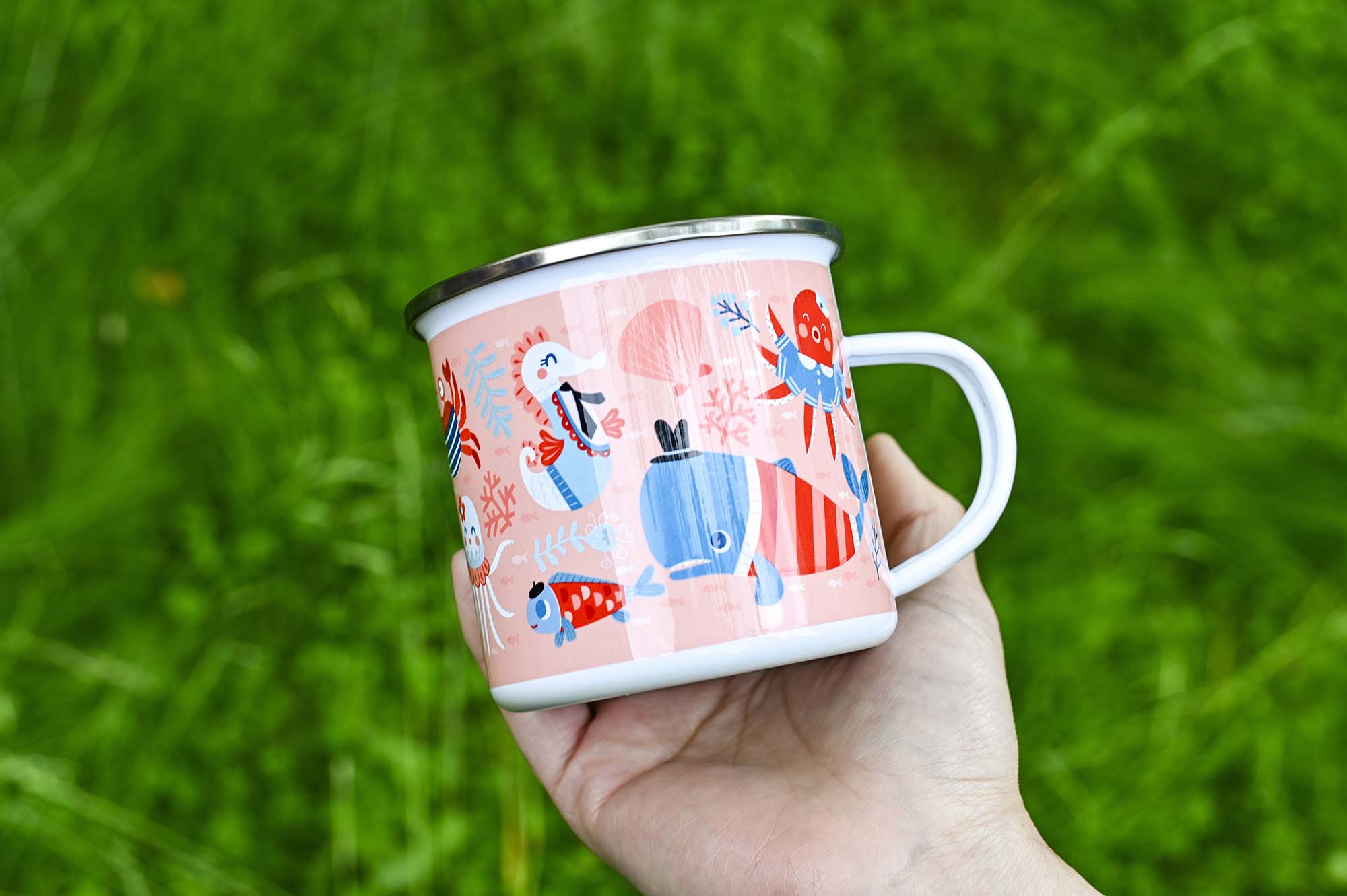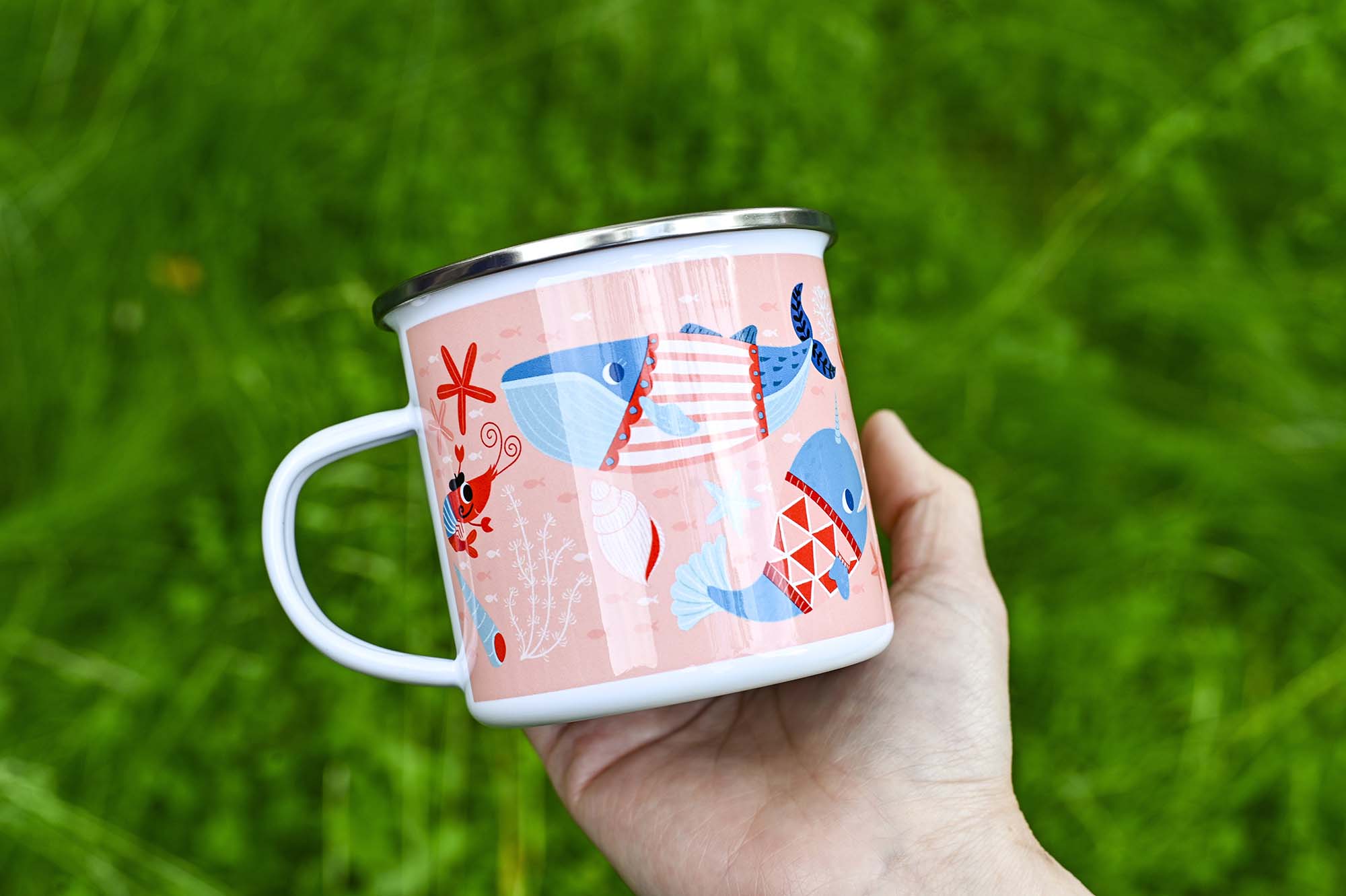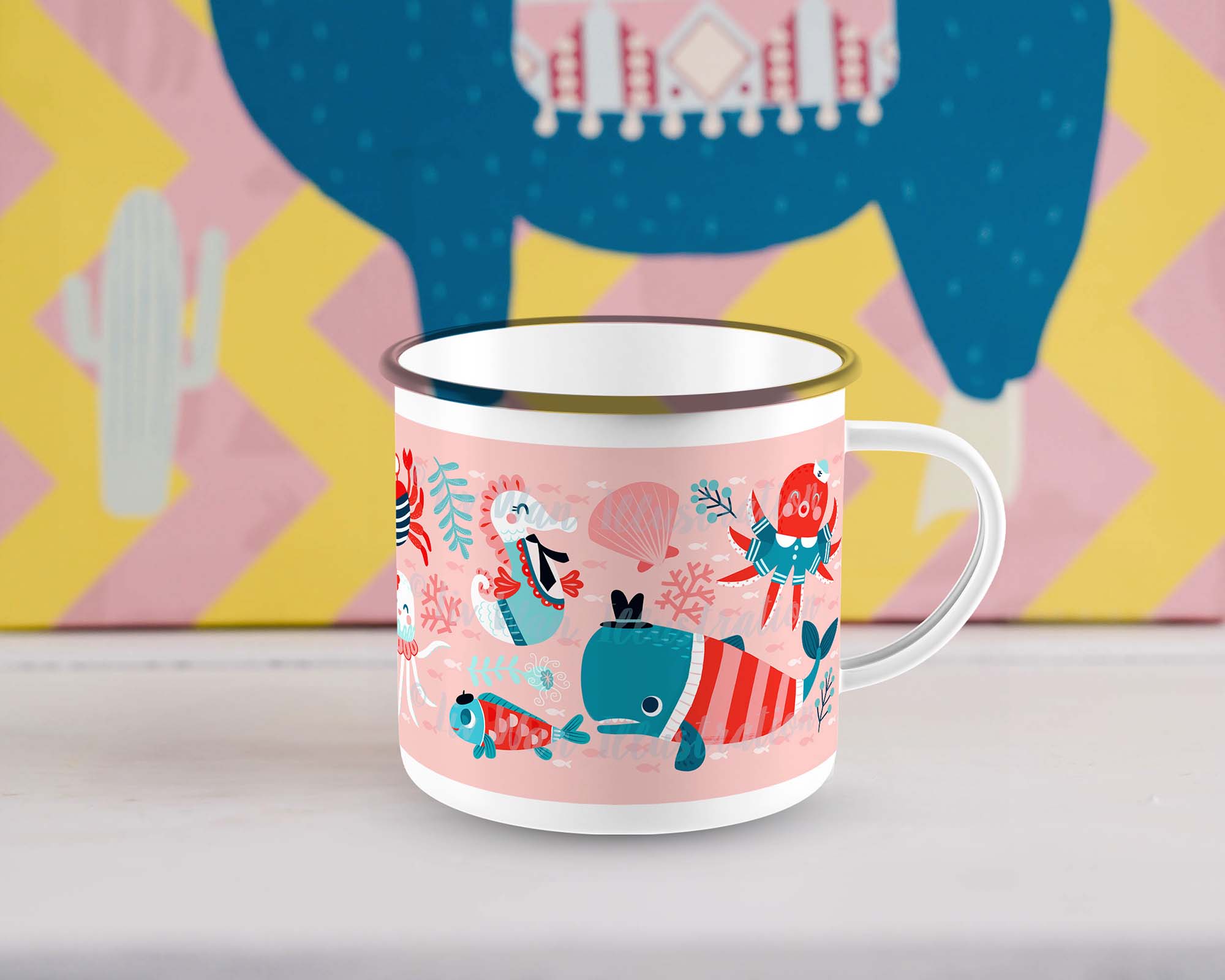 12-ounce enamel mug with an ocean theme. Over the last few years I’ve had the pleasure of creating many different pattern designs for a number of clients so for 2024 I’ve made a whole series of new enamel mugs using my pattern designs.