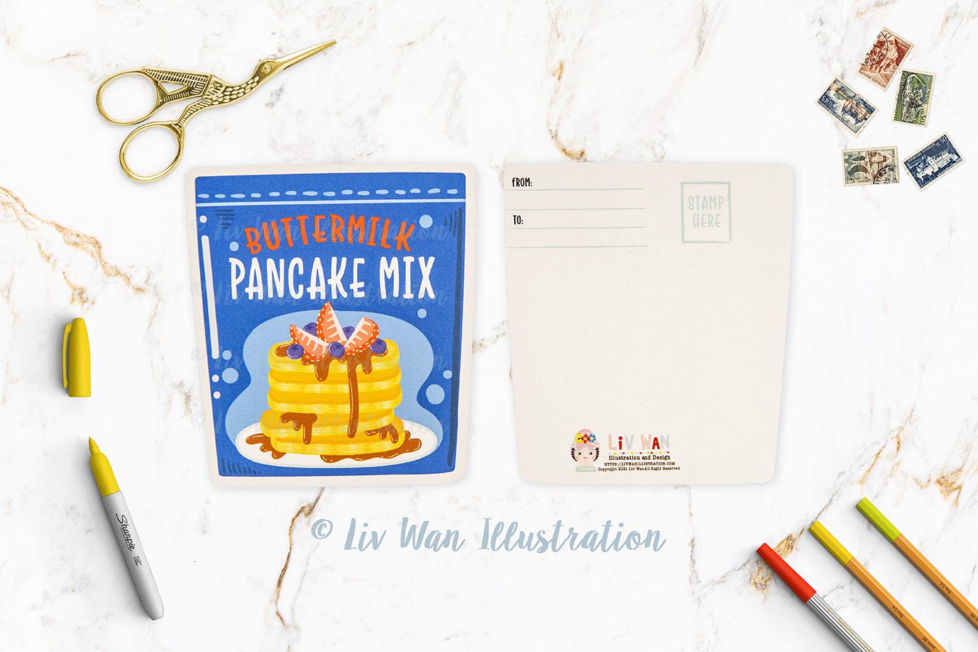 This Pancake Mix Postcard is A6 (10.5 × 14.8cm) in size and is printed on a beautiful heavyweight fine-art textured paper by myself, which provides beautiful colours, contrast, texture and is a joy to write on. This is a die-cut postcard which I have expertly cut out myself using a commercial plotter cutter. These are really expensive but ensure the lines are cut perfectly and everything is exactly the same size.