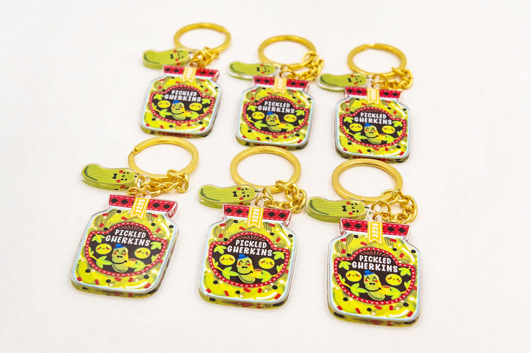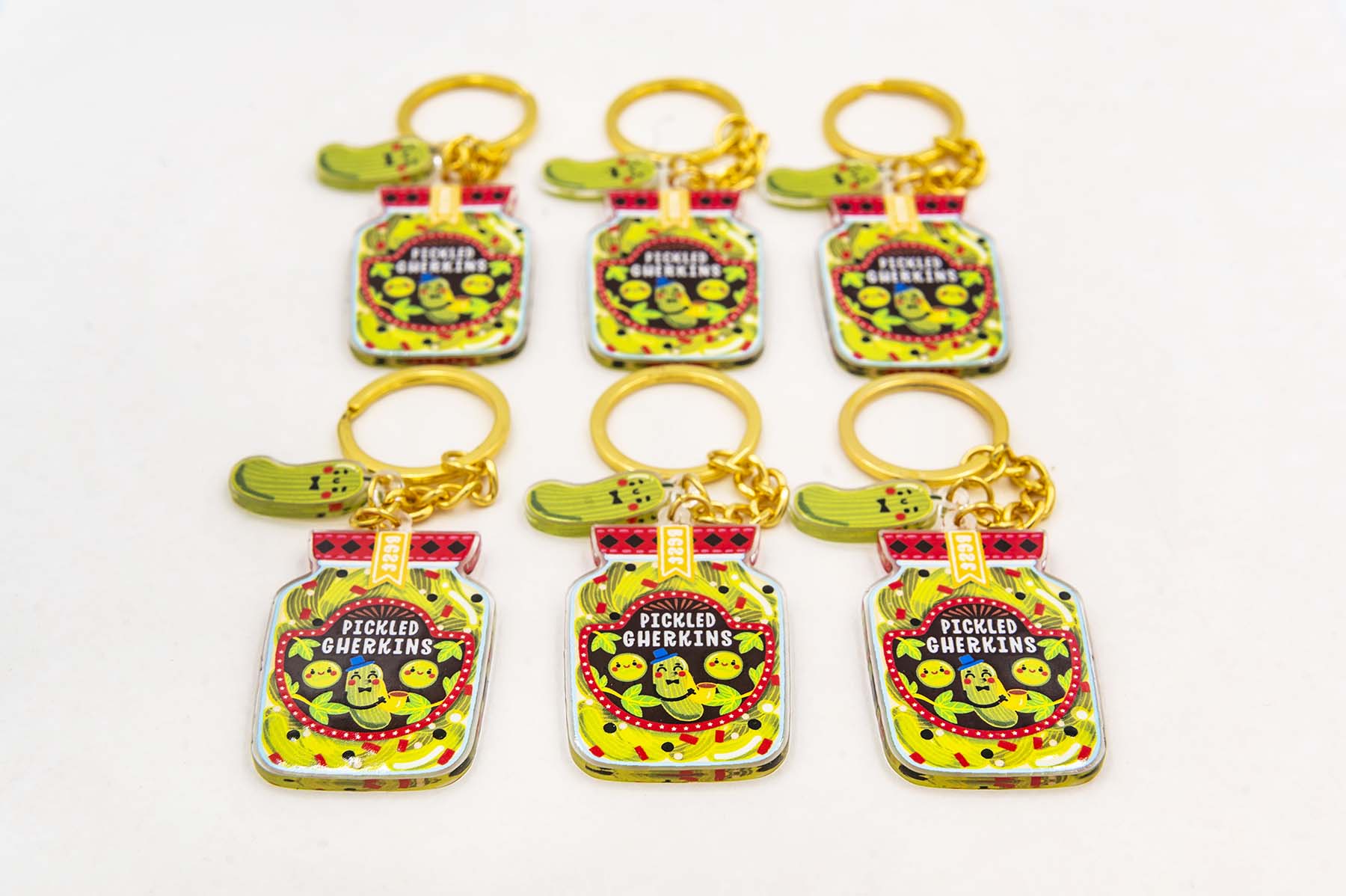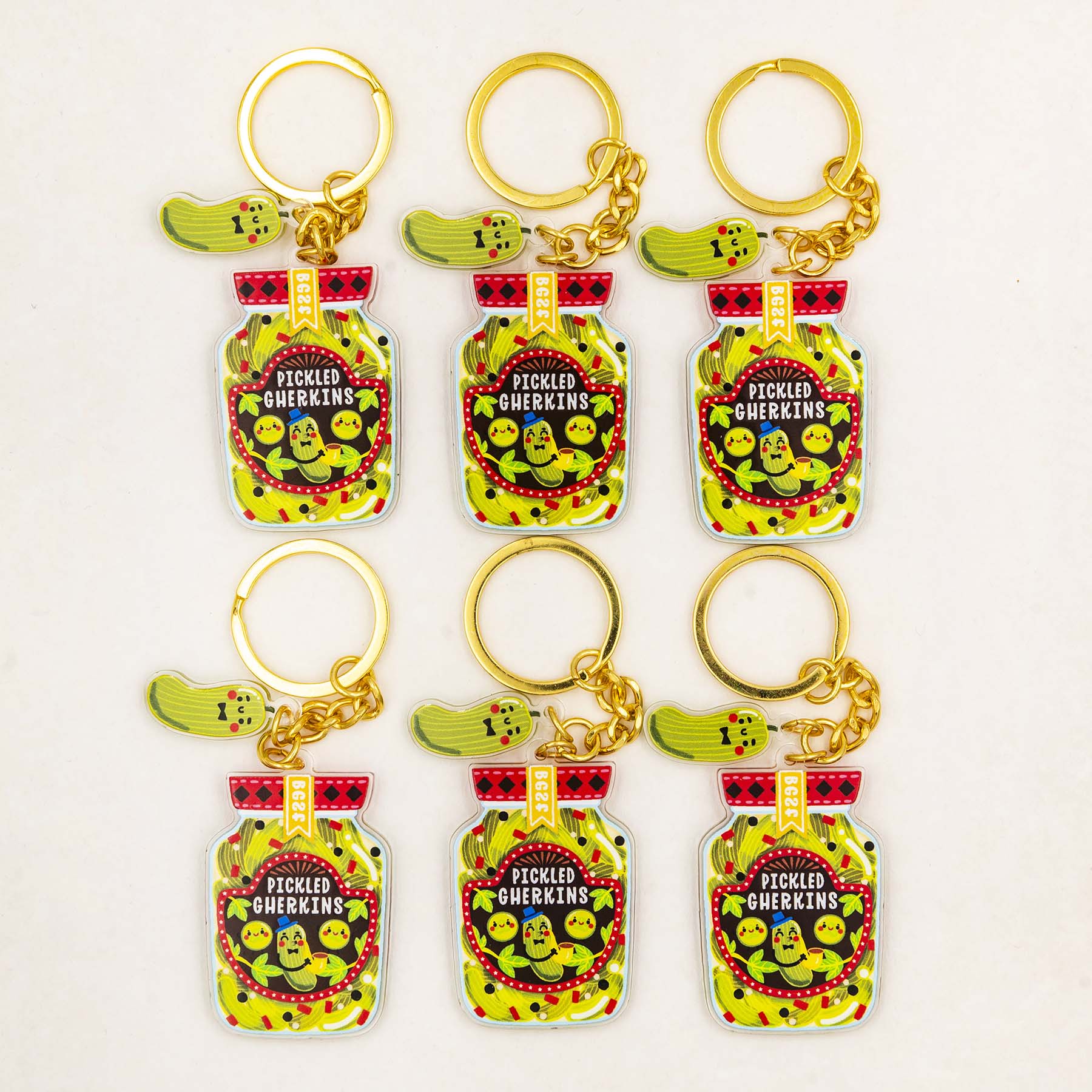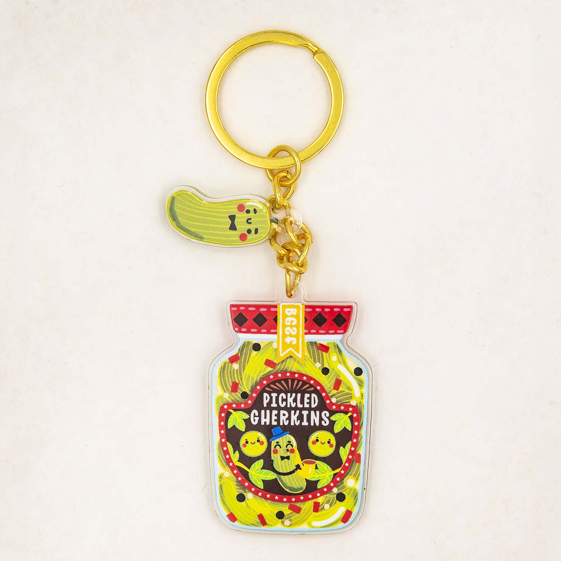 This Pickled Gherkins Keychain is made from 100% recycled eco-friendly acrylic and measures 2.5 inches along its longest length. It comes supplied with a gold chain and an additional keychain charm attached.