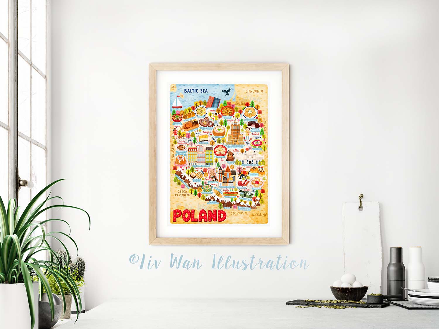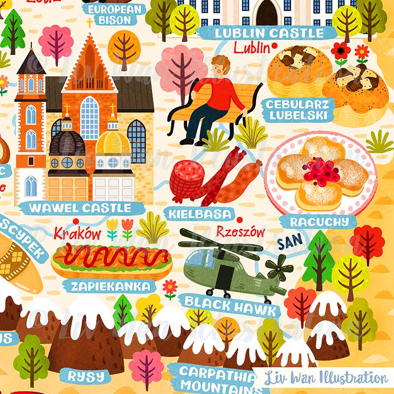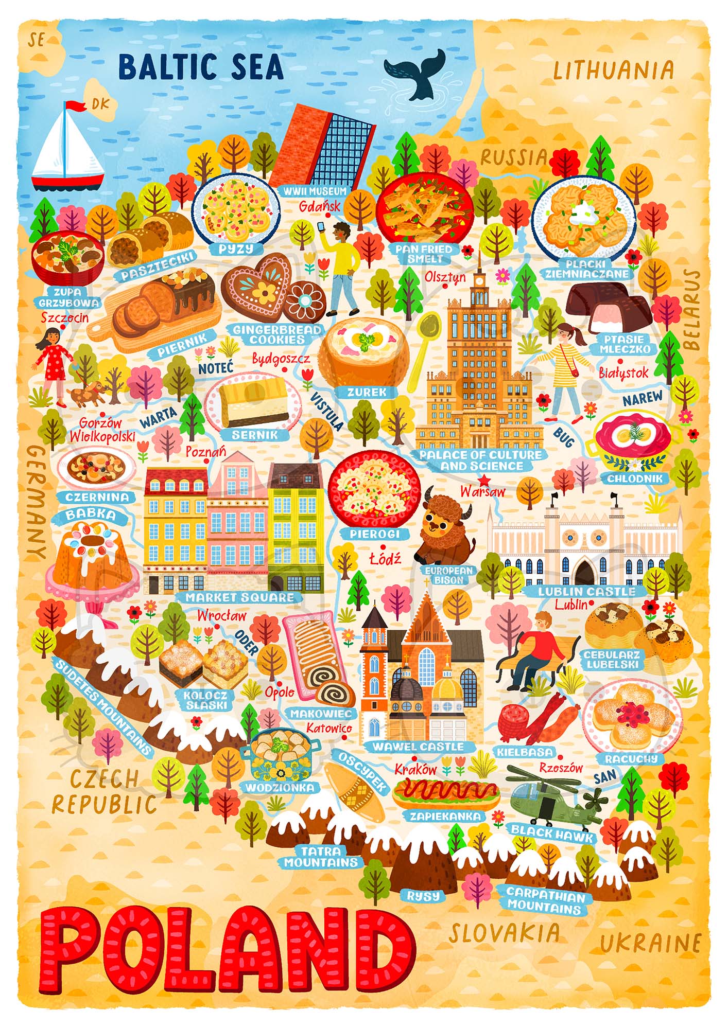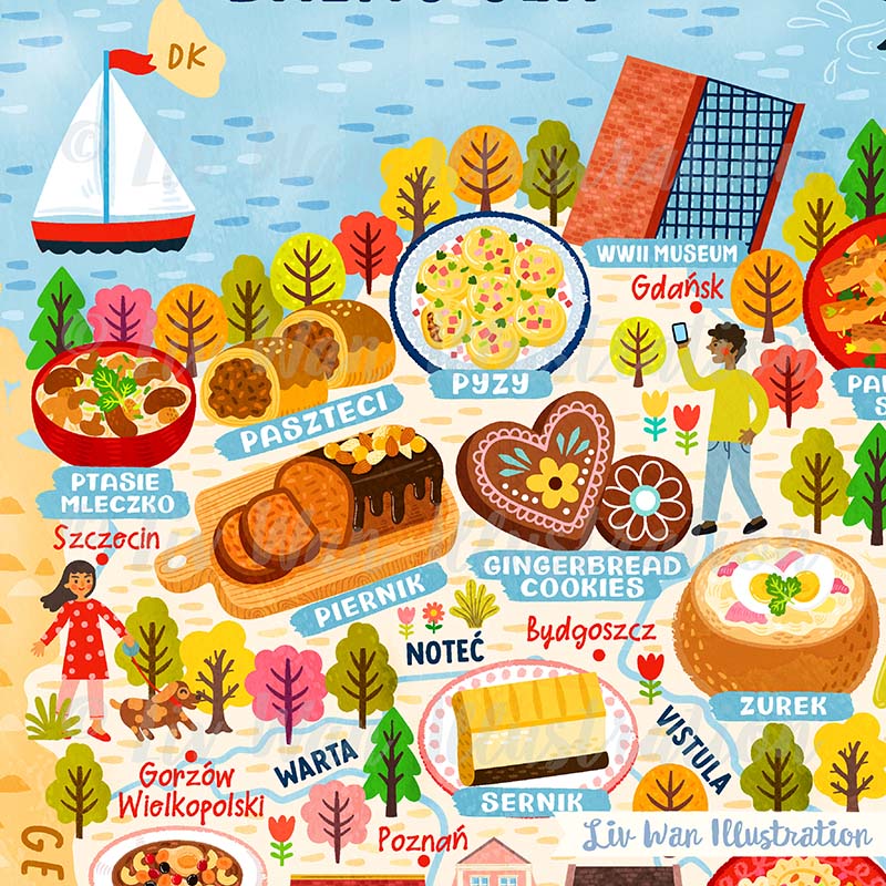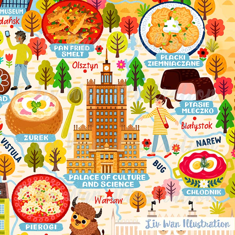 As with all of my maps, there are absolutely tonnes of detail in this Poland Map Poster. There are people, buildings, cities, animals, food and many other things.