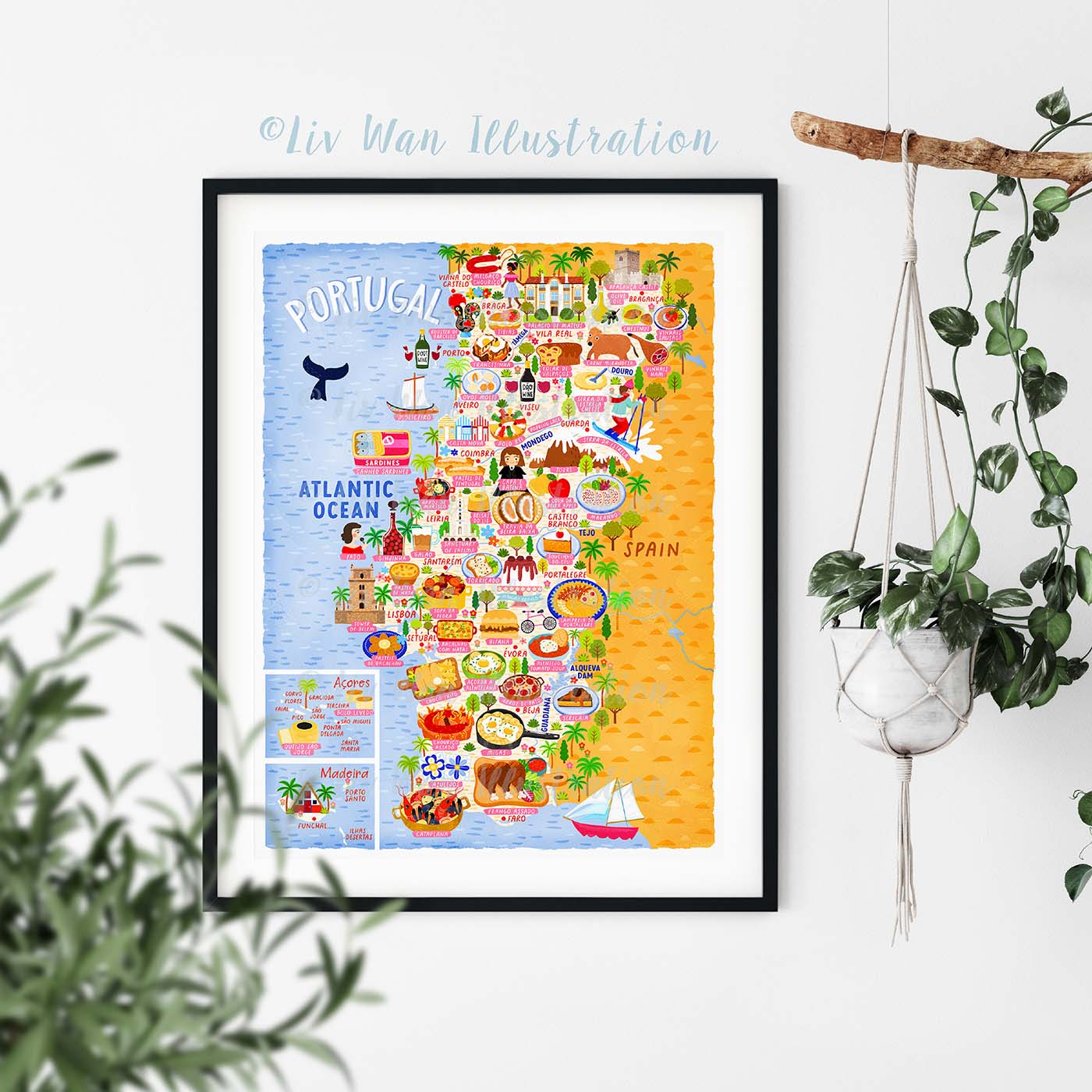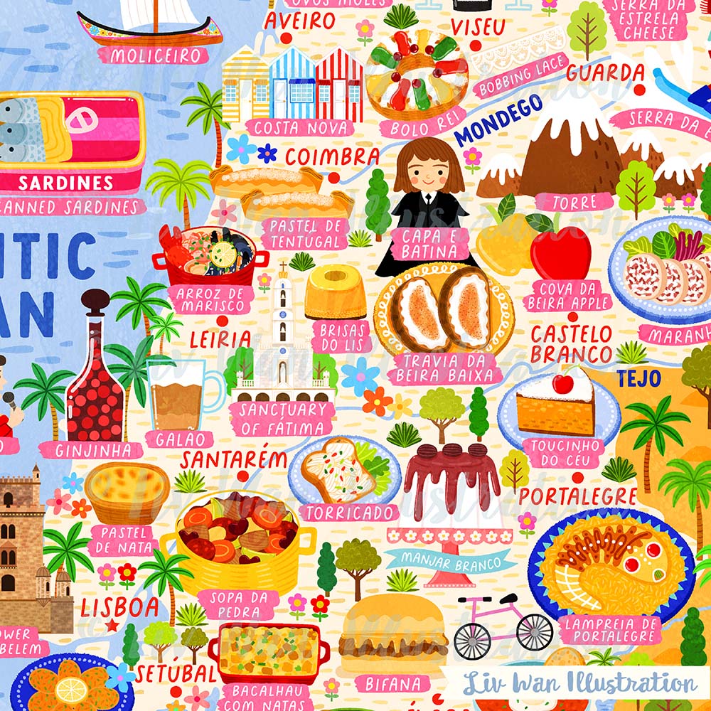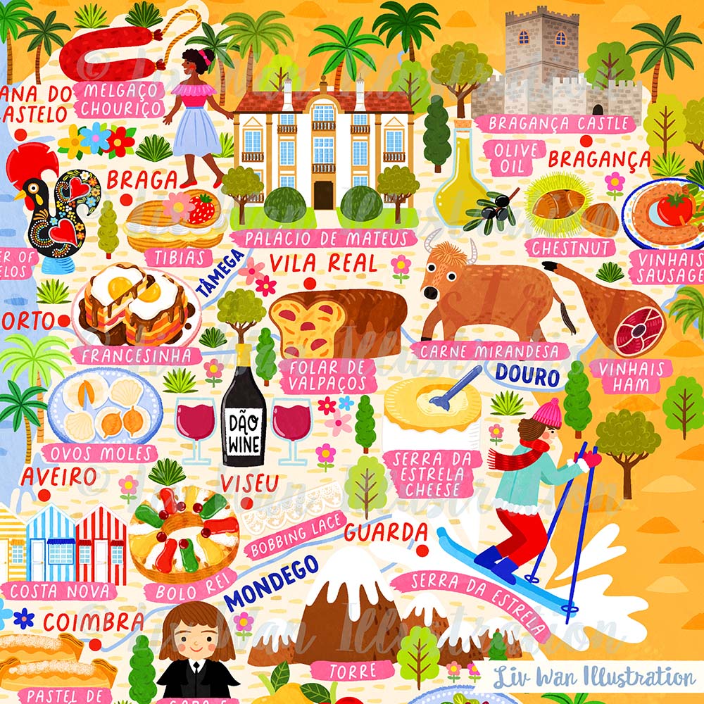 As with all of my maps, there are absolutely tonnes of detail in this Portugal Map Poster. There are people, buildings, cities, animals, food and many other things.