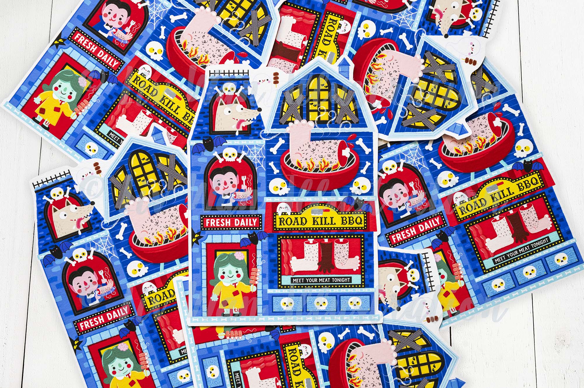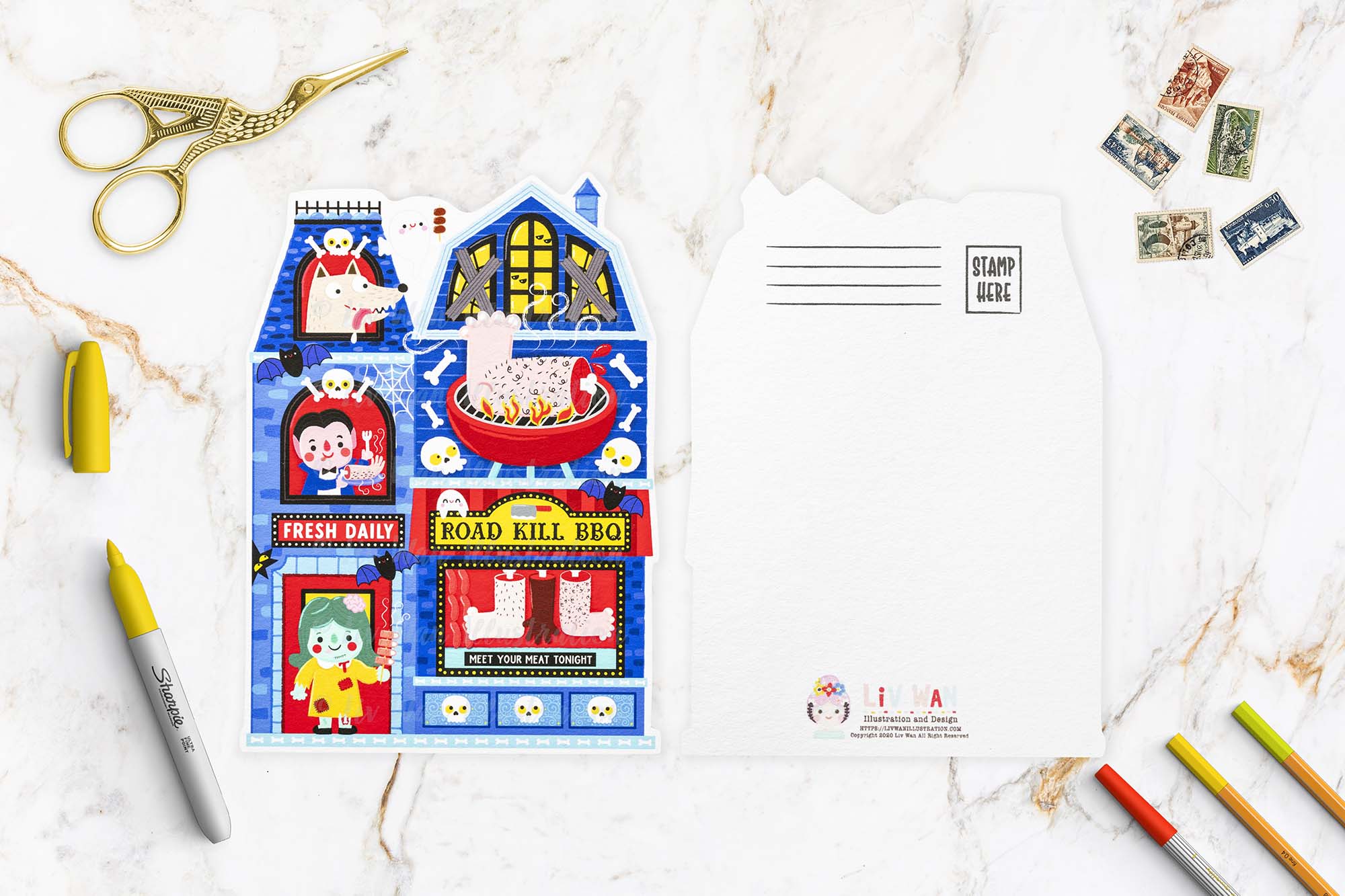 For 2025 I’ve created eight brand new postcards which is made up of 7 die-cut shaped postcards and 1 rectangle with a halloween shop theme.