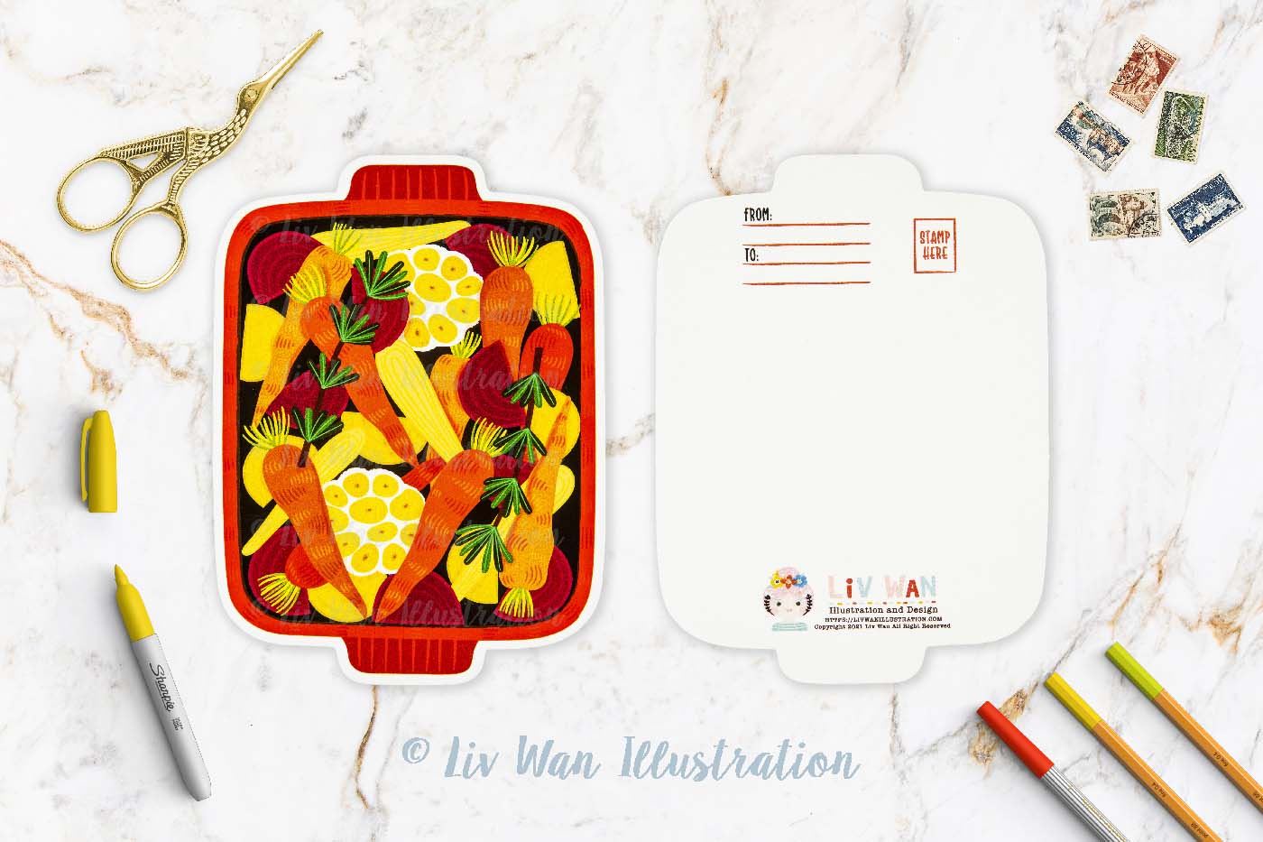 This Roast Vegetables Postcard is A6 (10.1 × 14.2cm) in size and is printed on a beautiful heavyweight fine-art textured paper by myself, which provides beautiful colours, contrast, texture and is a joy to write on. This is a die-cut postcard which I have expertly cut out myself using a commercial plotter cutter. These are really expensive but ensure the lines are cut perfectly and everything is exactly the same size.