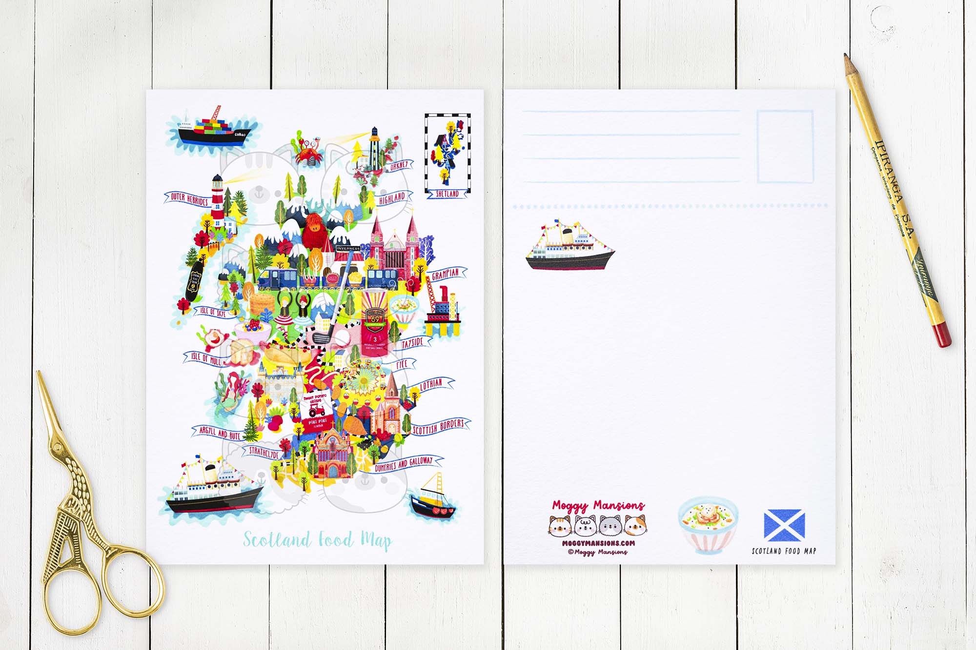 This Scotland Food Map Postcard has been designed and made by Moggy Mansions. There has been no outsourcing, no printing in a foreign country whatsoever. This ensures this product is of the highest quality.