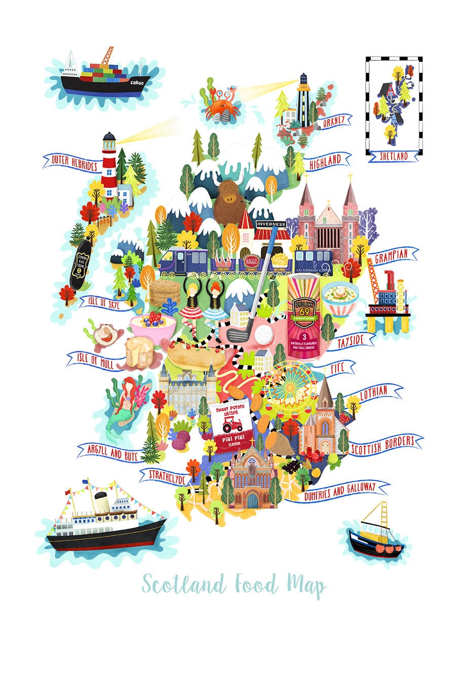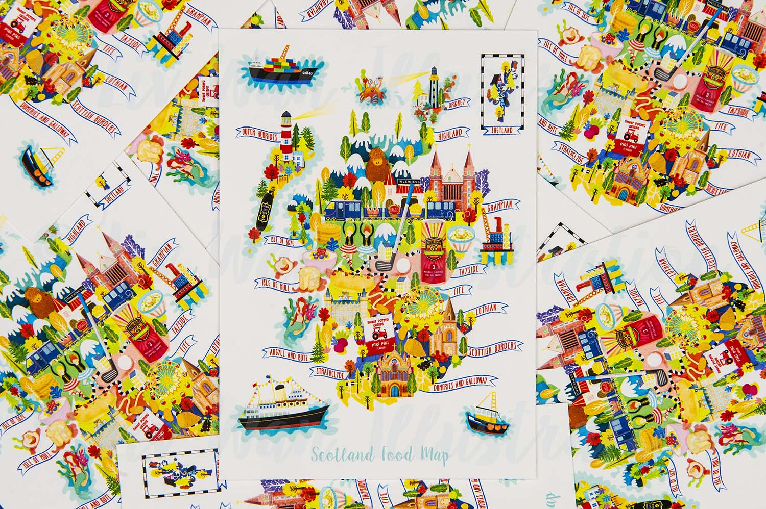 Scotland has been my home for the last decade so I decided to create this Scotland food map postcard illustration to celebrate my happy life in Scotland and it’s delicious food and drink.