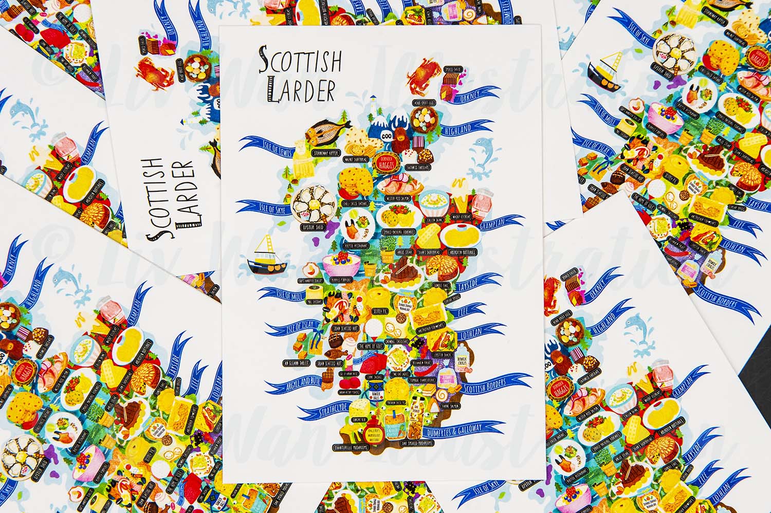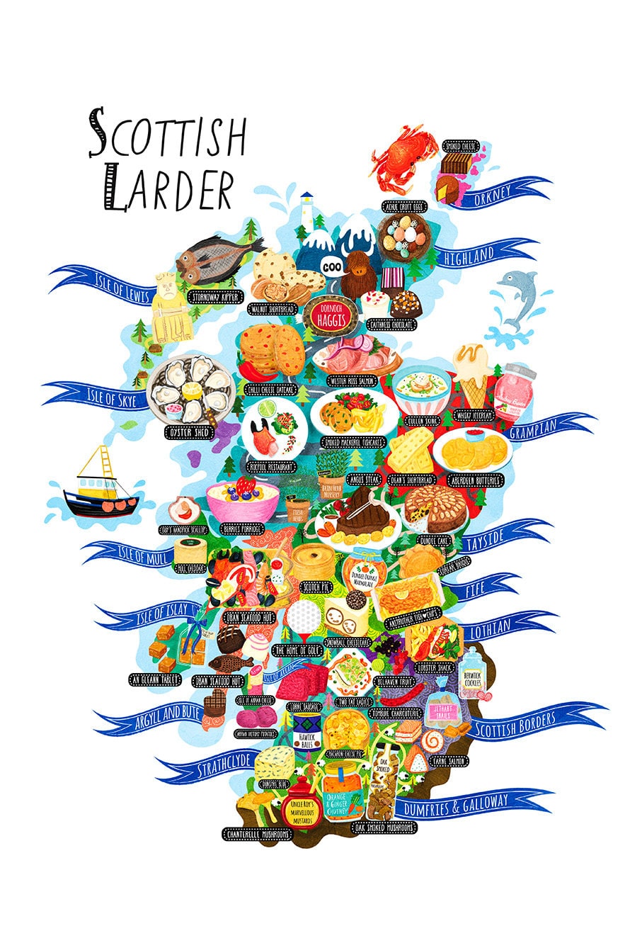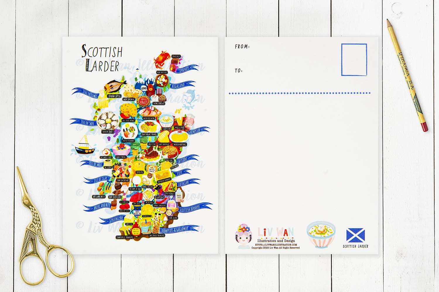 I illustrated this Scottish Larder postcard map illustration to celebrate my life in Scotland and the delicious local produce, food, and drinks from Scotland.