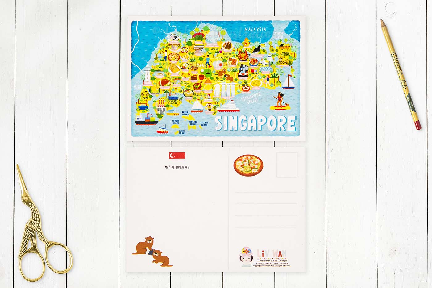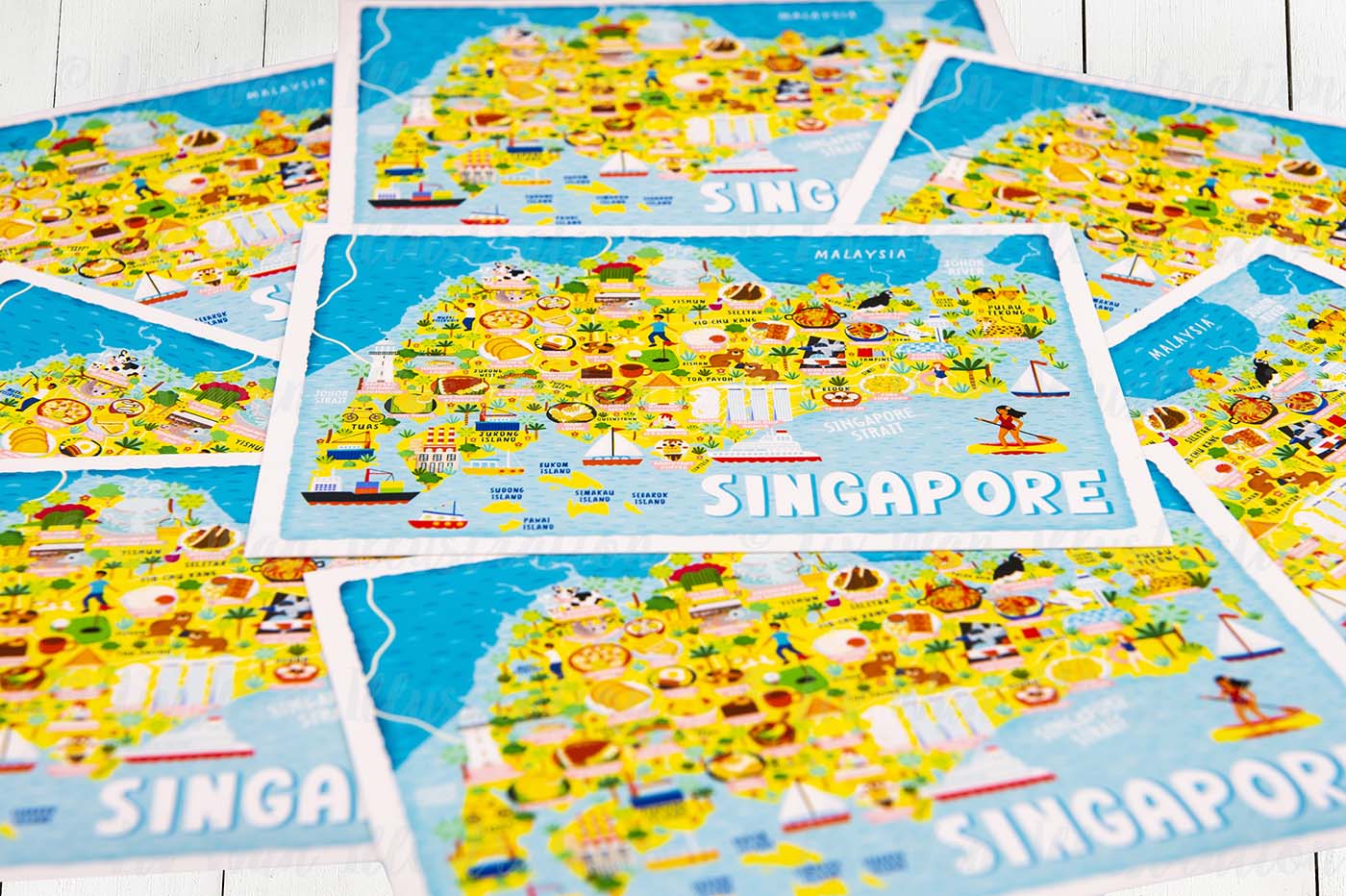As with all of my maps, there are absolutely tonnes of detail in this Singapore Map Postcard. There are people, buildings, cities, animals, food and many other things.