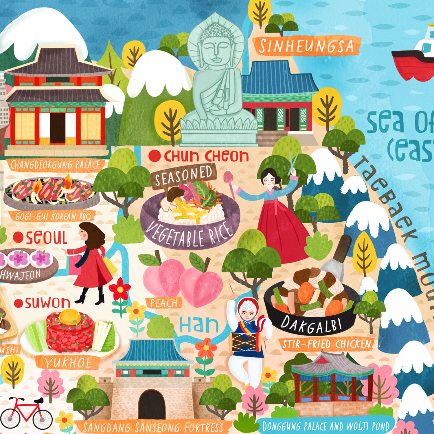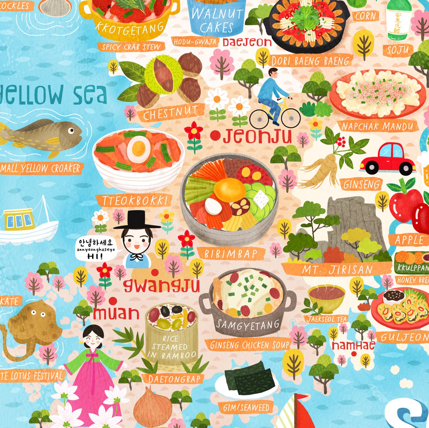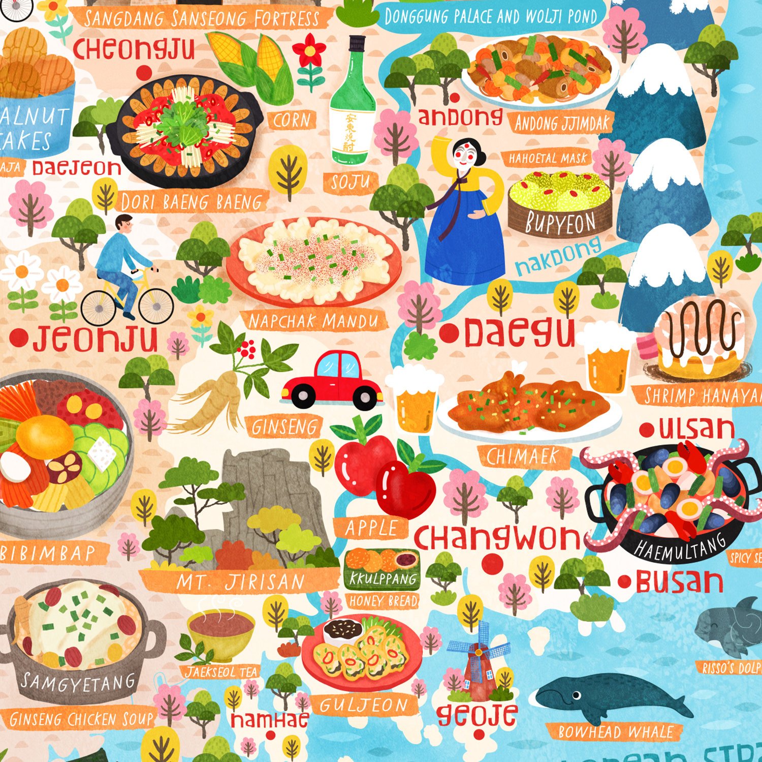 I love South Korean food and South Korean culture has been very popular in the world in recent years so I illustrated this map of South Korea for this amazing country! Now, of course, I haven’t eaten every dish from South Korea but I do love everything that I have tried from there and kimchi is one of my all-time favourite things to eat. In the future, I would love to go to South Korea again and draw another map but this time based on the sights and cultures.