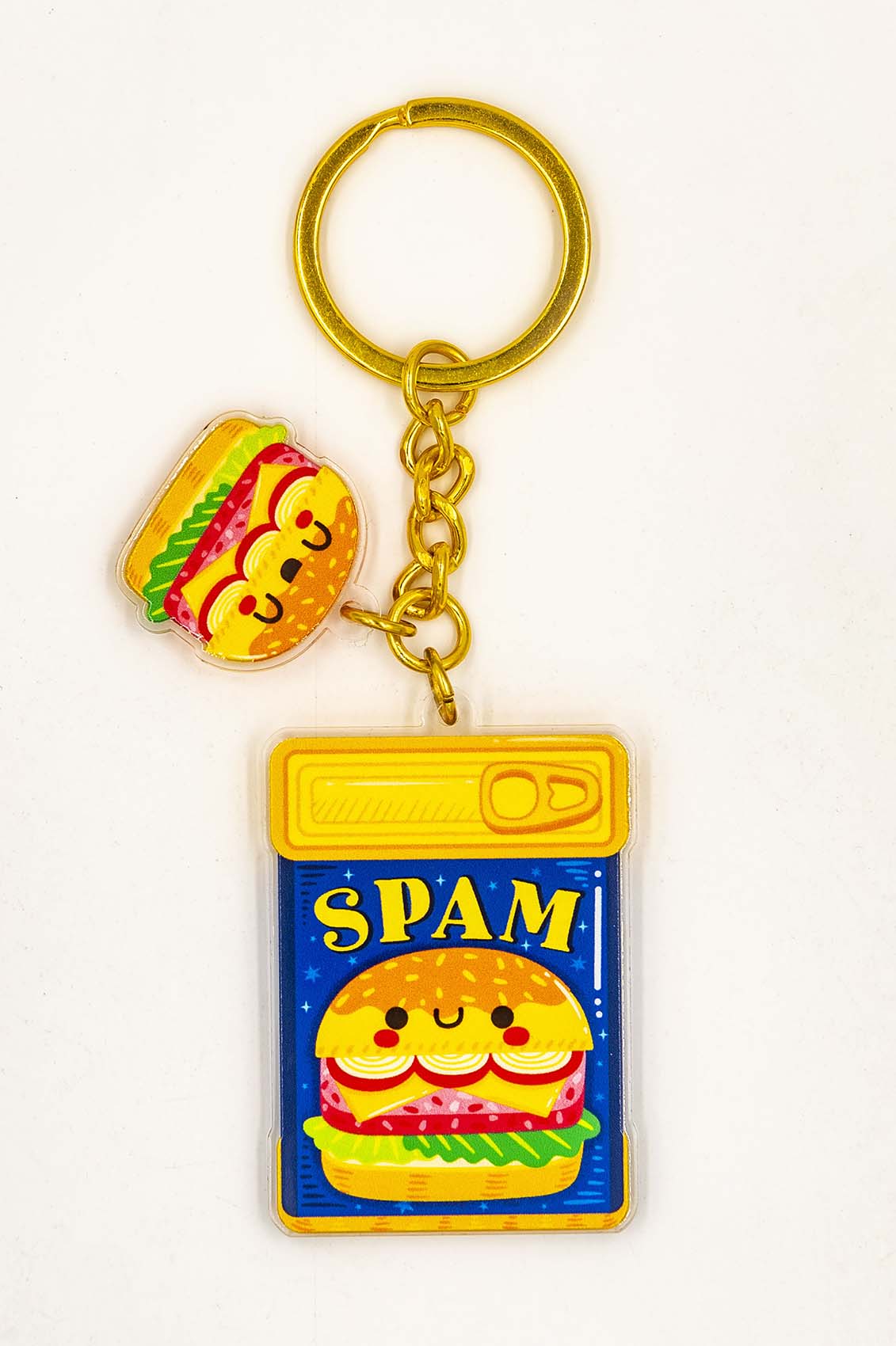 Brand new for 2023, I have created multiple keychains that are super fun and colourful. This Spam Keychain is made from 100% recycled eco-friendly acrylic and measures 2.5 inches along its longest length. It comes supplied with a gold chain and an additional keychain charm attached.