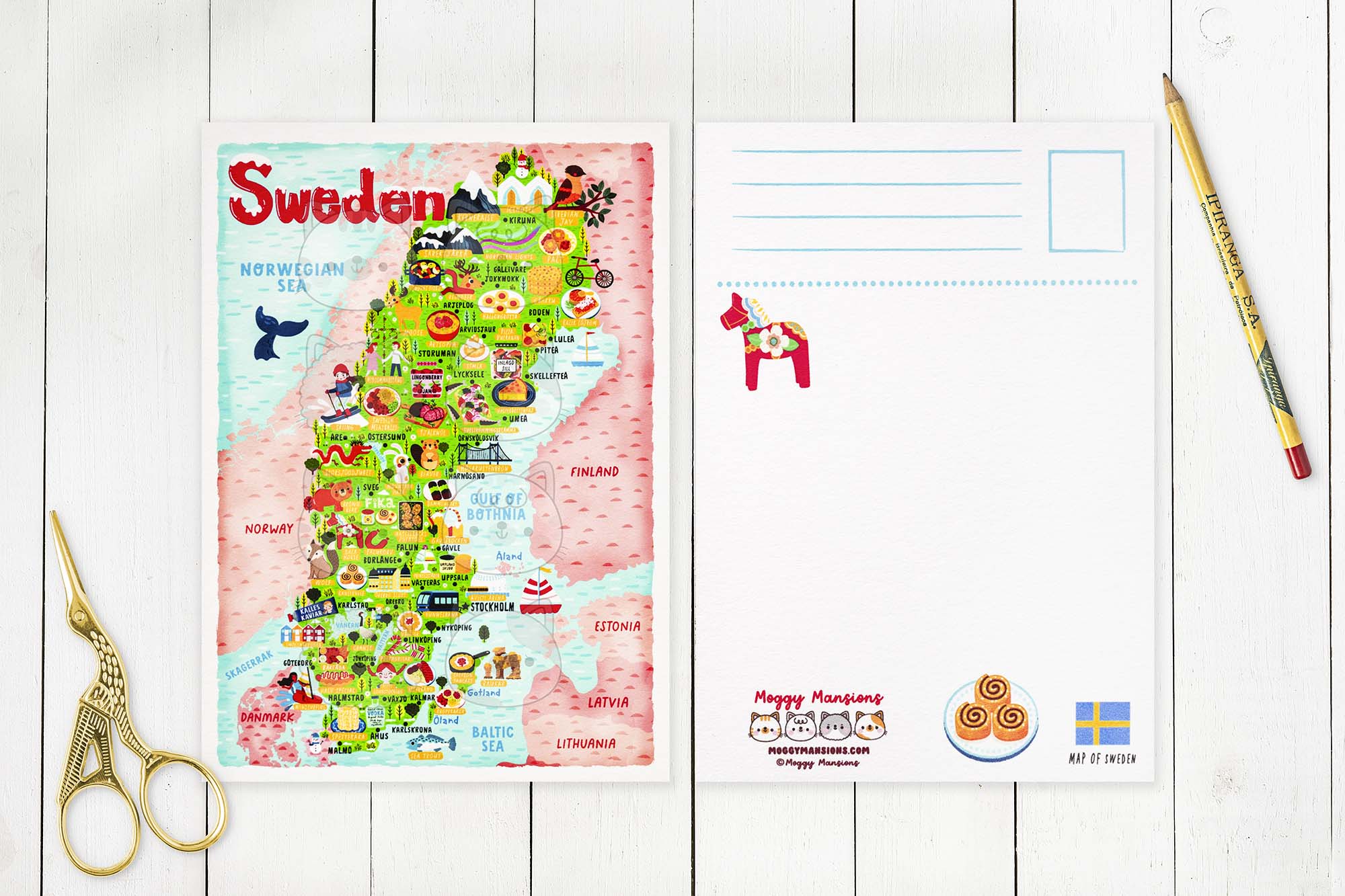 This Sweden map postcard has been designed and made by Moggy Mansions. There has been no outsourcing, no printing in a foreign country whatsoever. This ensures this product is of the highest quality.